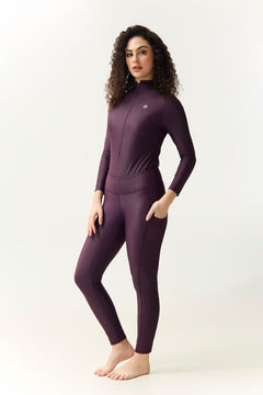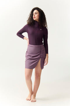 The Amal bodysuit is a classic long-sleeved one-piece swimsuit with an ultra-sleek design, high neck, front zip to the waist and oh-so-flattering. Per all of our suits, this swimsuit gives you UPF50+ Sun Protection for those areas most prone to sunburn: shoulders, back, chest and arms. Jump into the water worry-free. This swimsuit is one of our most versatile designs as you can choose to wear it on its own or layer-up with the Swim Skirt or any of our Swim Bottoms for added modesty, protection from the elements or styling!