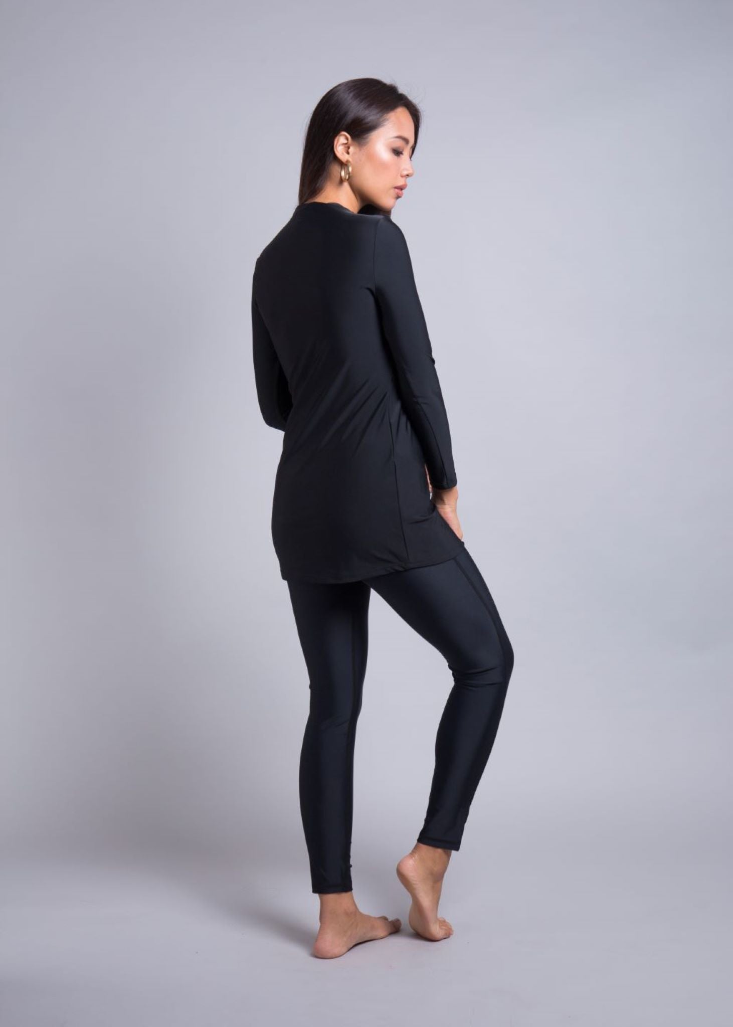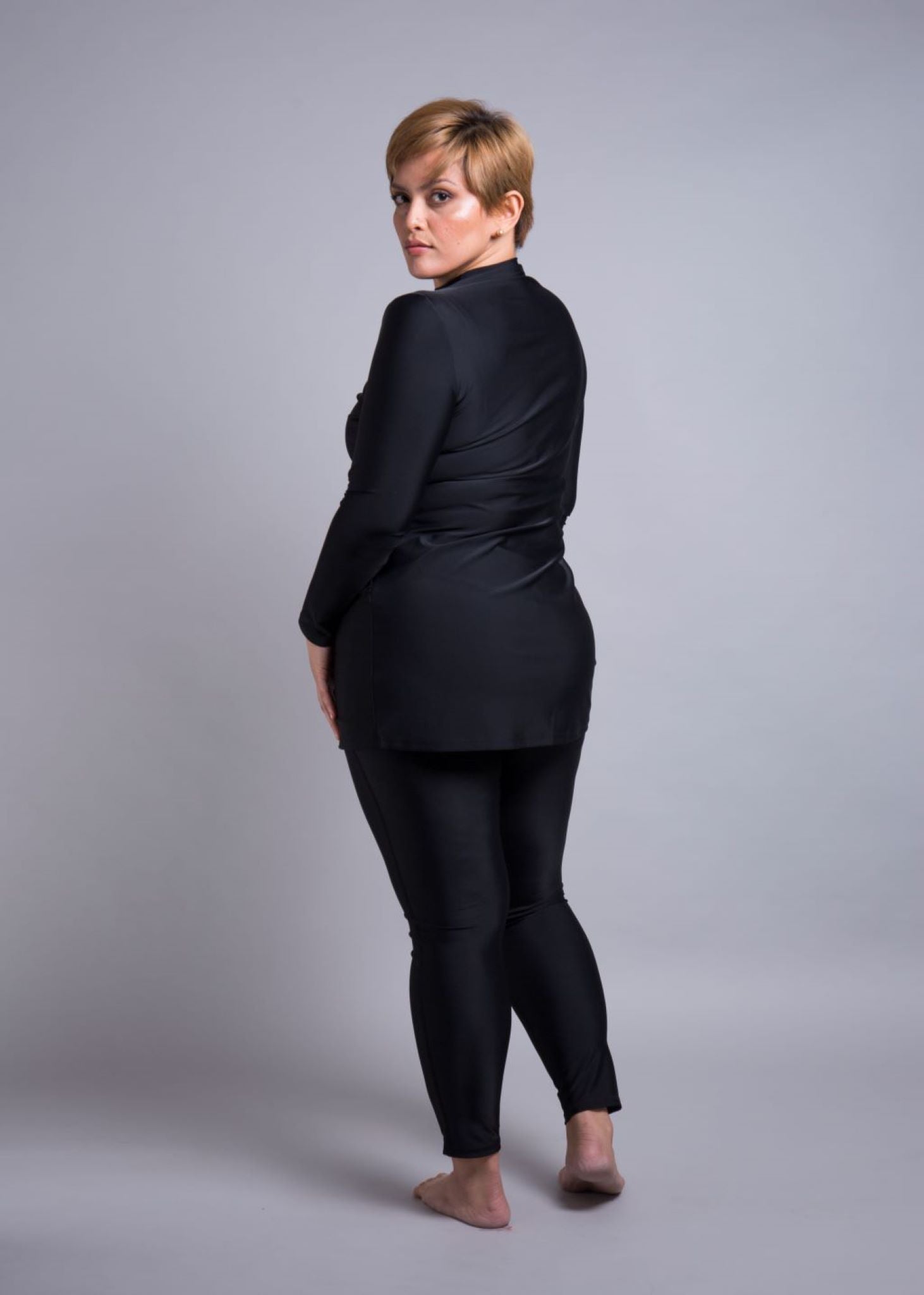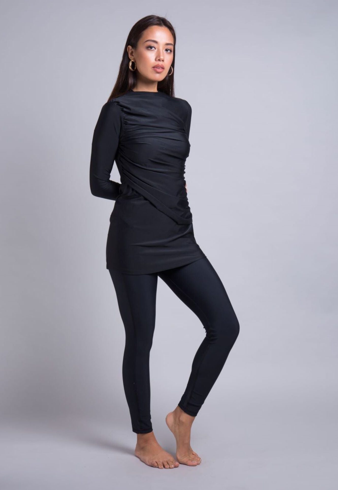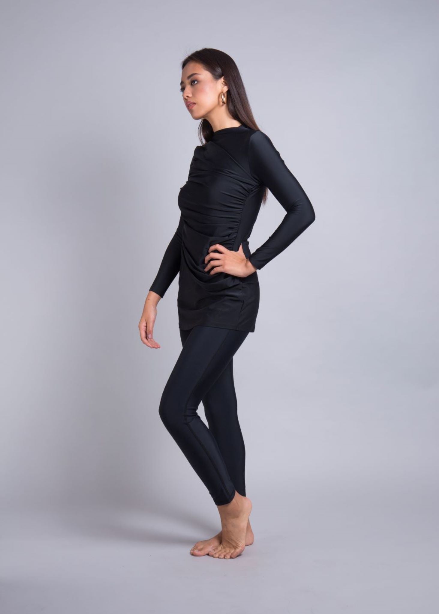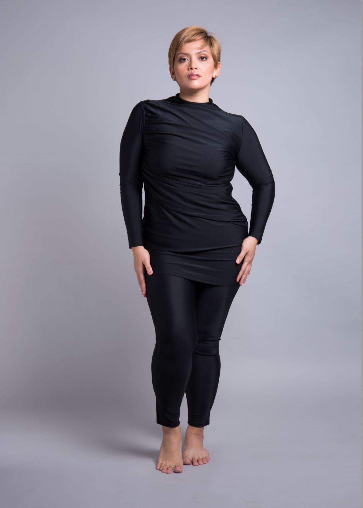 The top is designed as a relaxed-fit for your size. In other words, it’s not skin tight and should just graze over your body. There is a separate ruche panel that cascades from your right shoulder and arm to your left underarm and all the way to a few inches beneath your pelvic hip bone where your leg bends. This gives an extra layer of security, smoothing out your curves and allowing you not to worry about every lump and bump around your chest and tummy. For an average 5’5” woman, the length sits in line with the end of her extended fingers when placed to the side of her body.