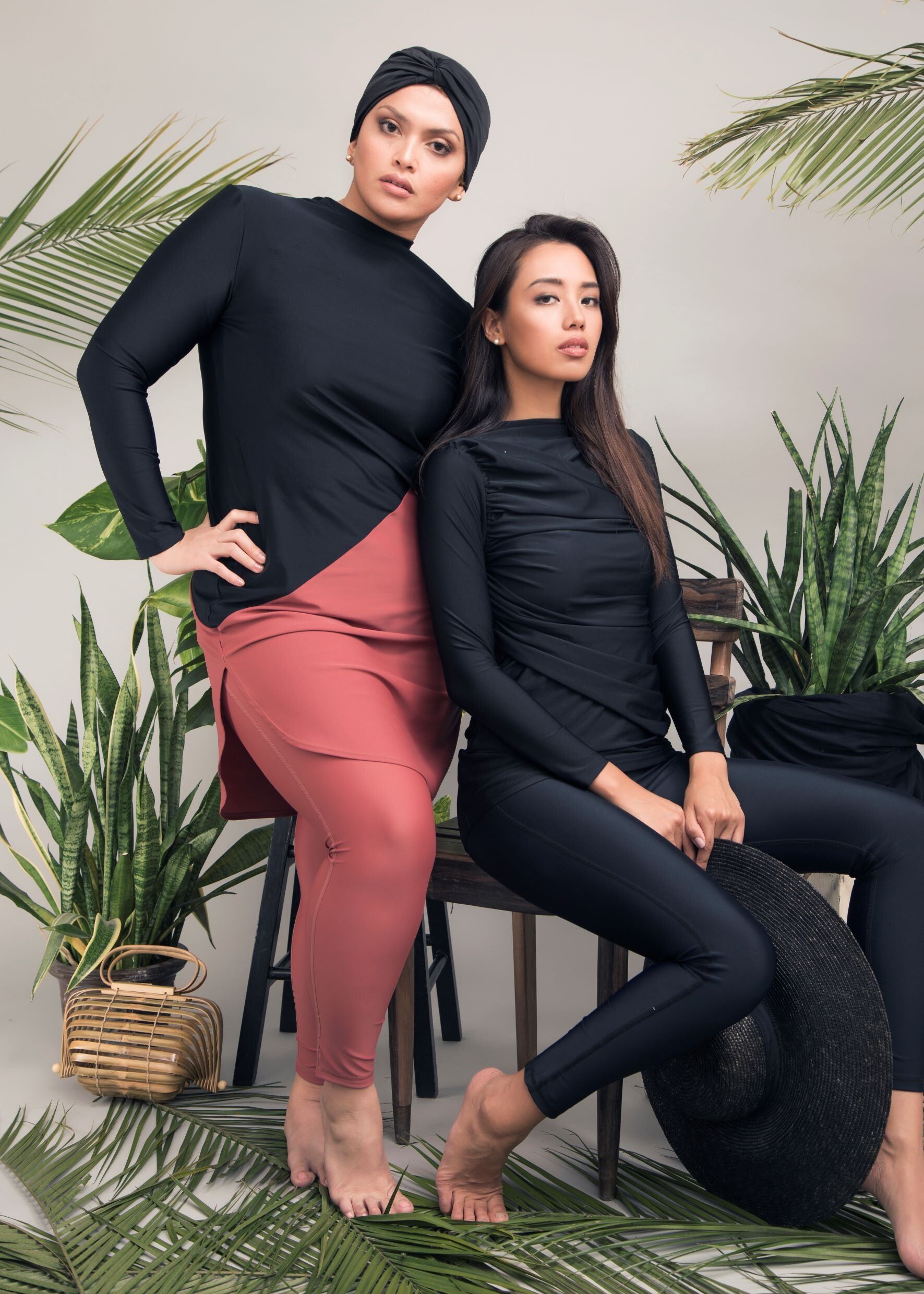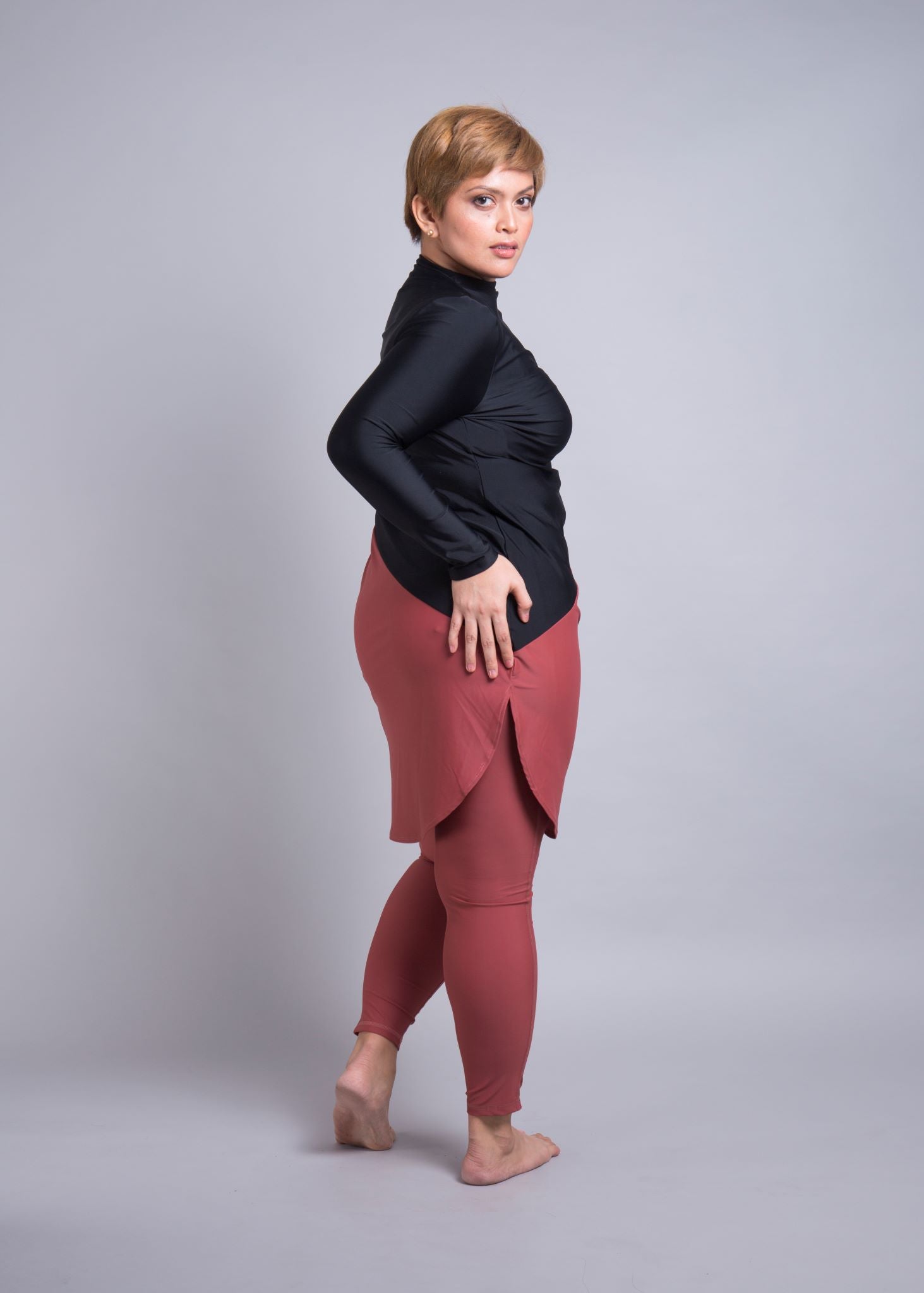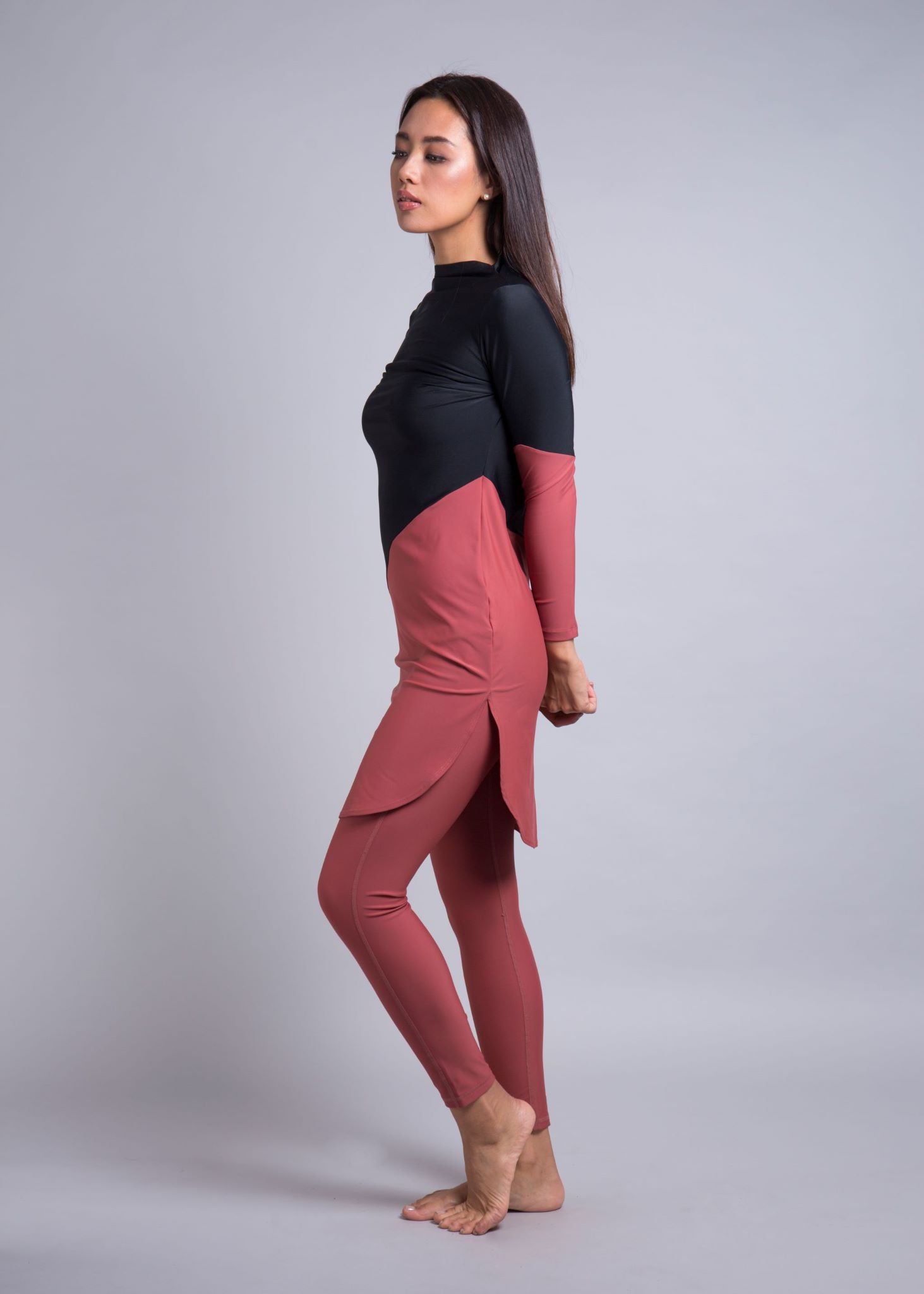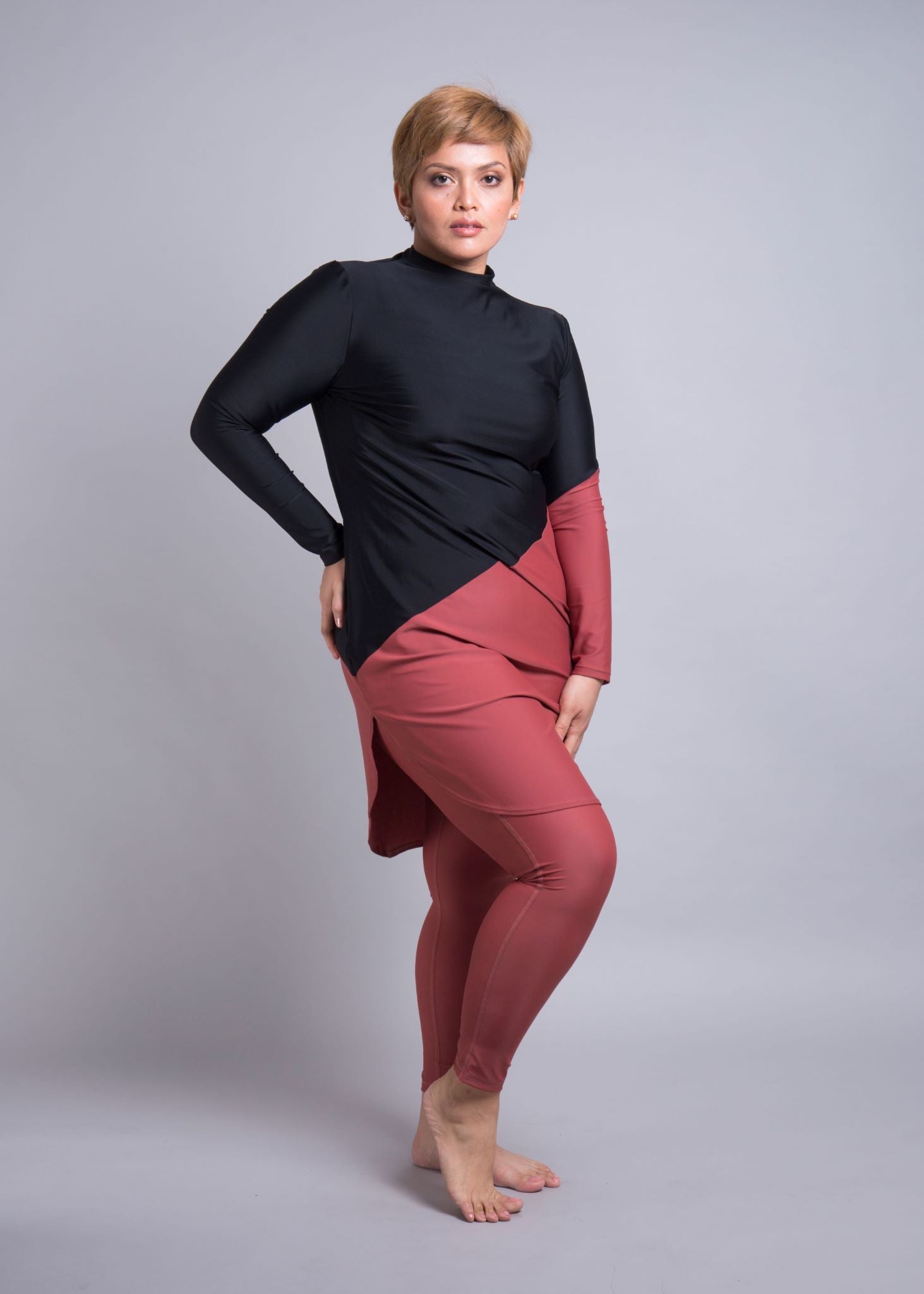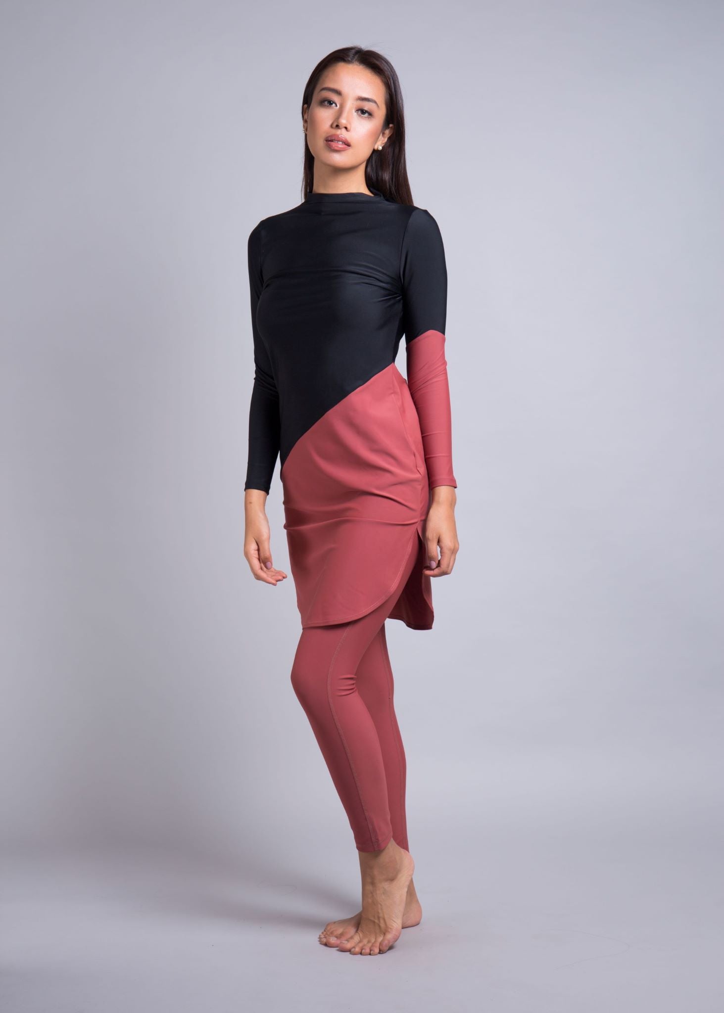 The top is designed as a relaxed-fit for your size. The diagonal cut between fabric colours creates a flattering break across your body. The longer length on this design fully covers your bottom and thighs and sits just above the knees of an average 5’5” woman. It includes slits on either side of the thighs to allow for comfortable movement despite its longer length.
