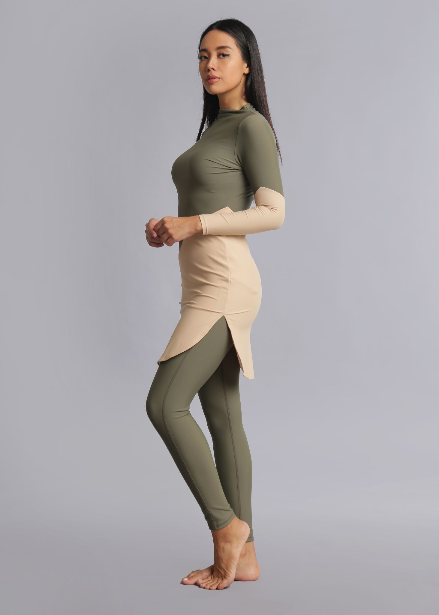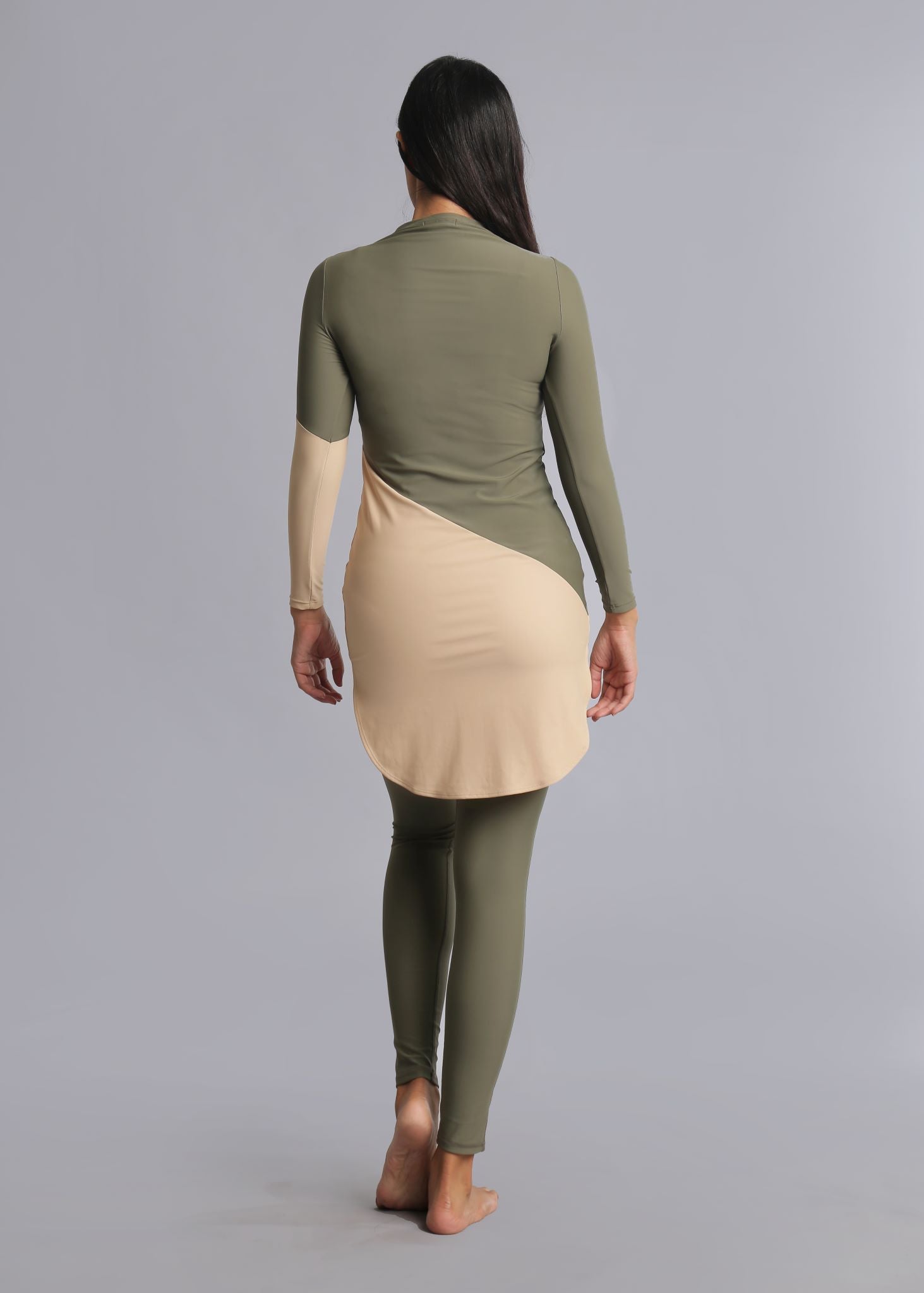 The top is designed as a relaxed-fit for your size. The diagonal cut between fabric colours creates a flattering break across your body. The longer length on this design fully covers your bottom and thighs and sits just above the knees of an average 5’5” woman. It includes slits on either side of the thighs to allow for comfortable movement despite its longer length.