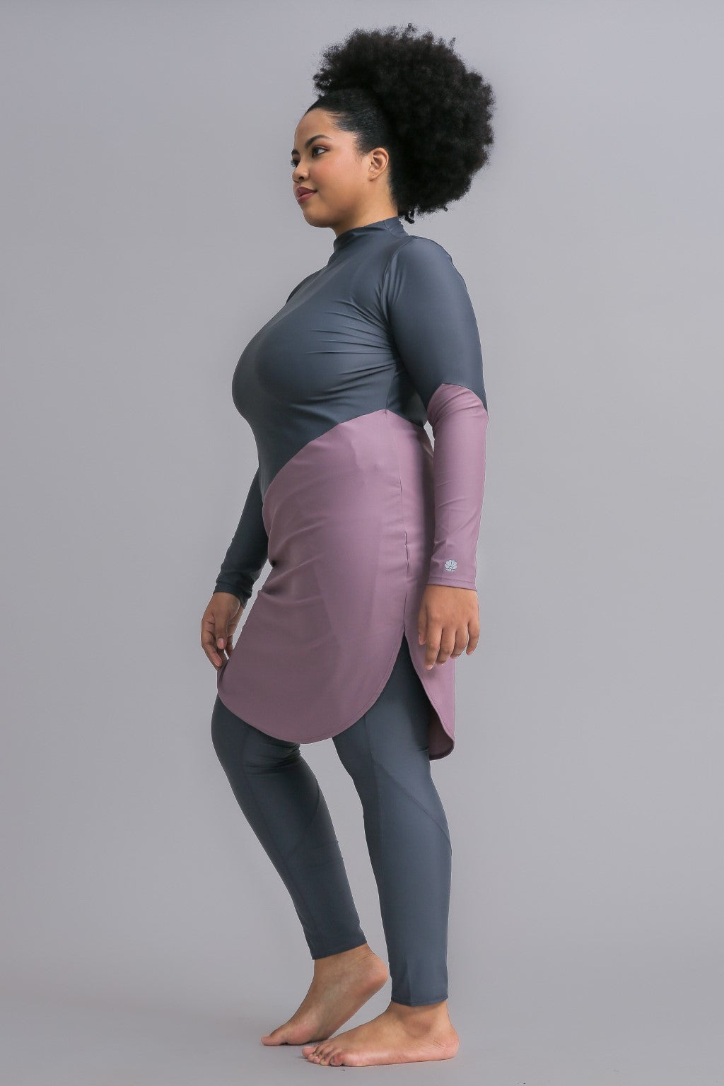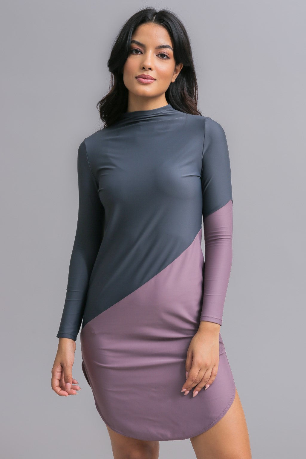 The Maya Swim Dress is designed as a relaxed-fit for your size. The diagonal cut between fabric colours creates a flattering break across your body. The longer length on this design fully covers your bottom and thighs and sits just above the knees of an average 5’5” woman. It includes slits on either side of the thighs to allow for comfortable movement despite its longer length.