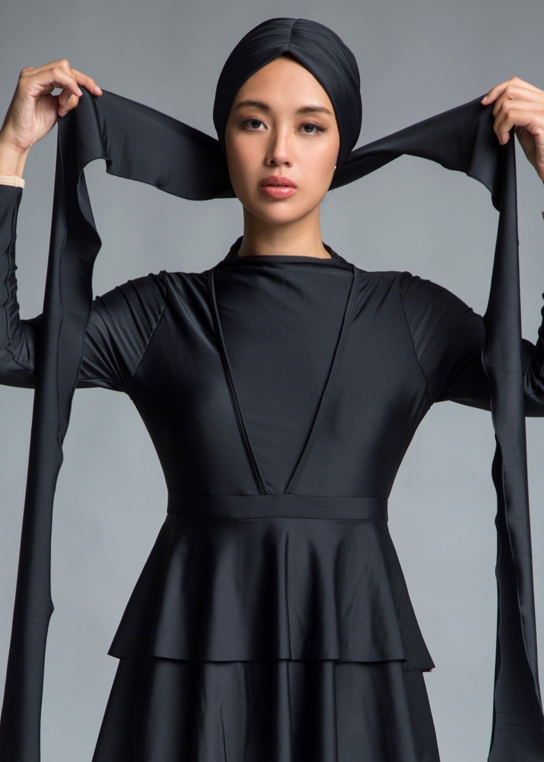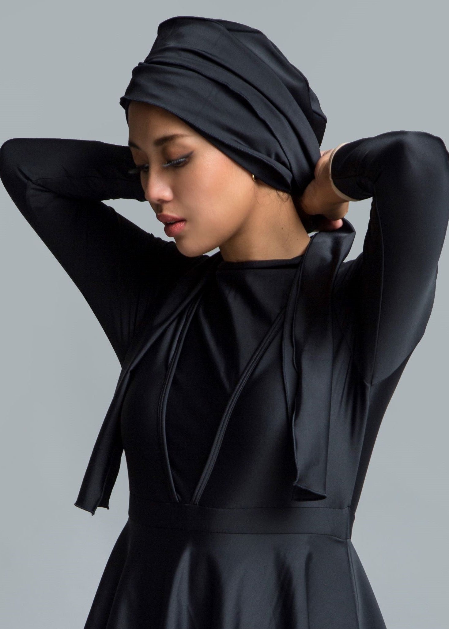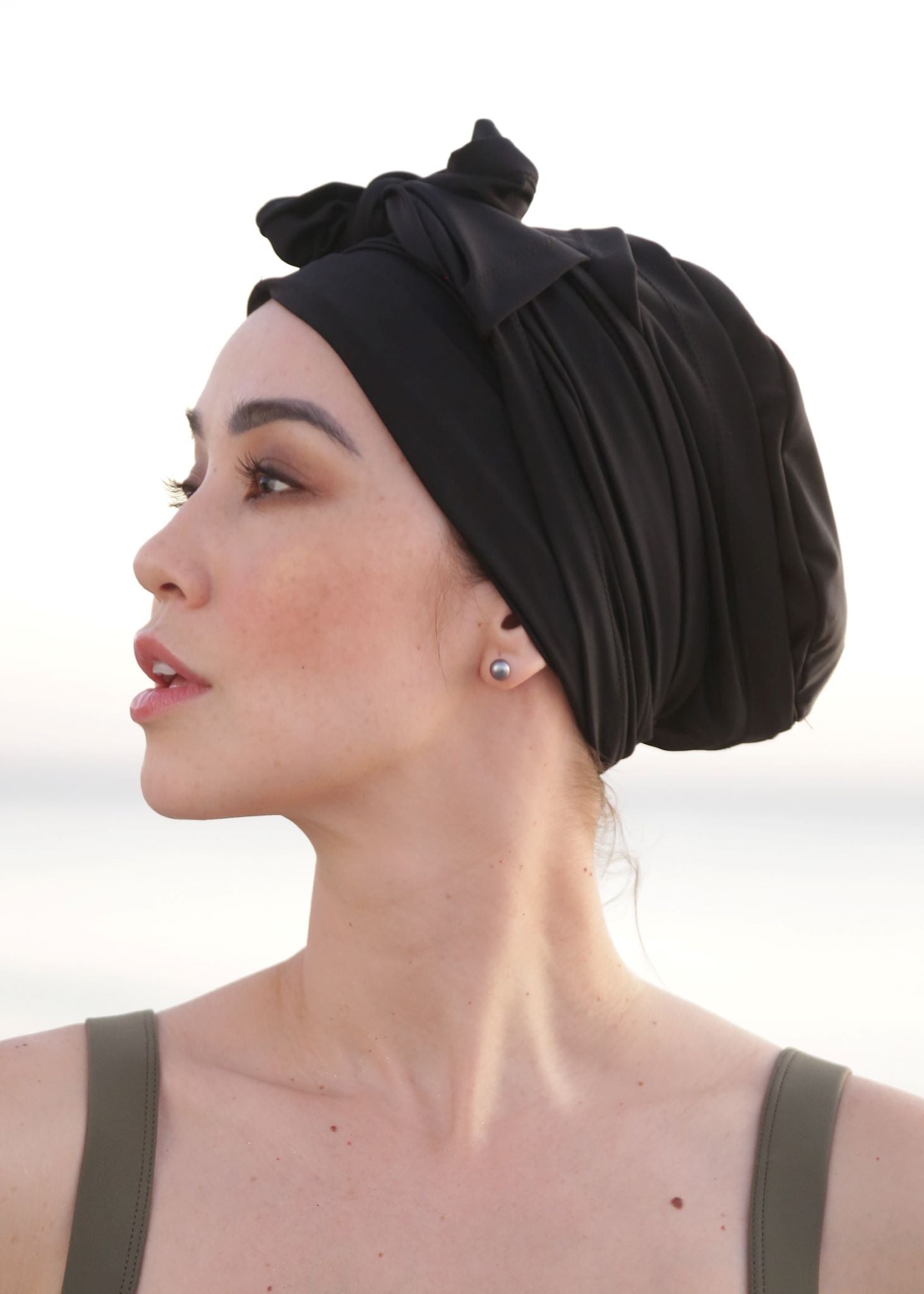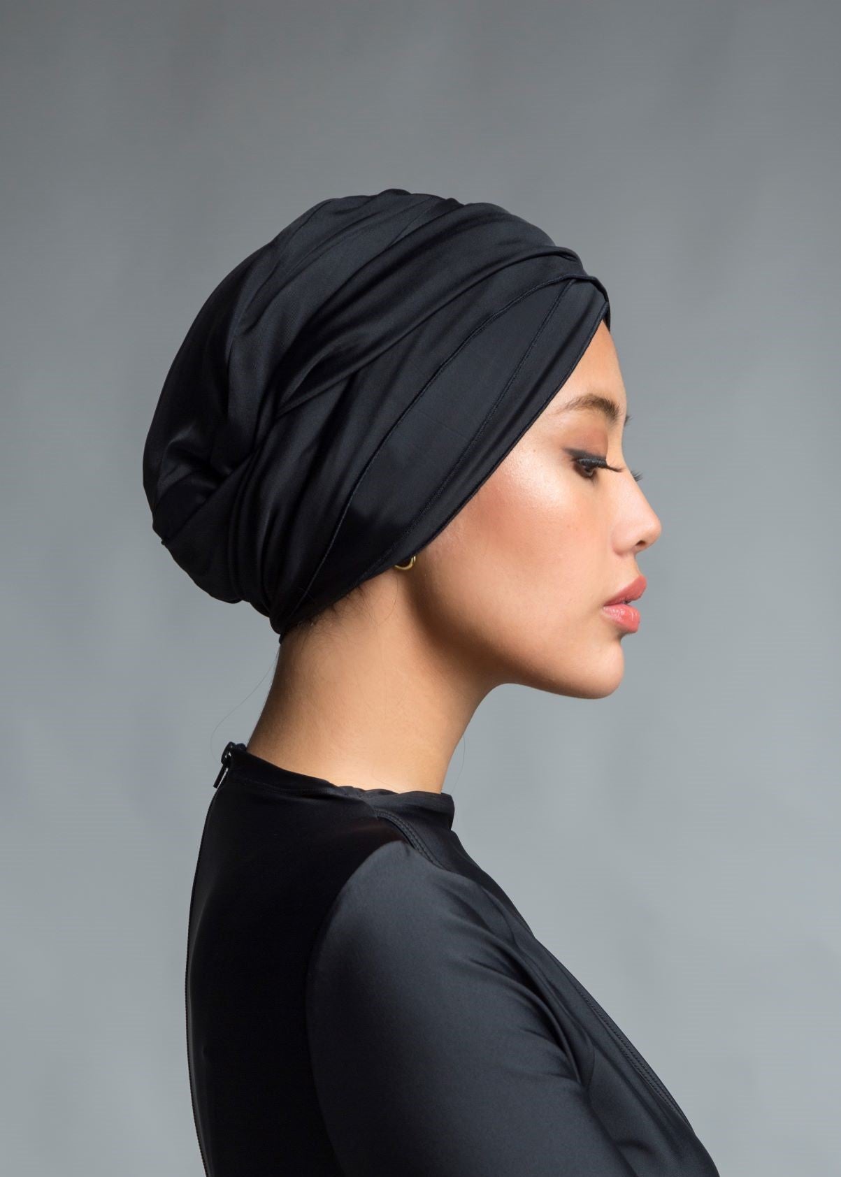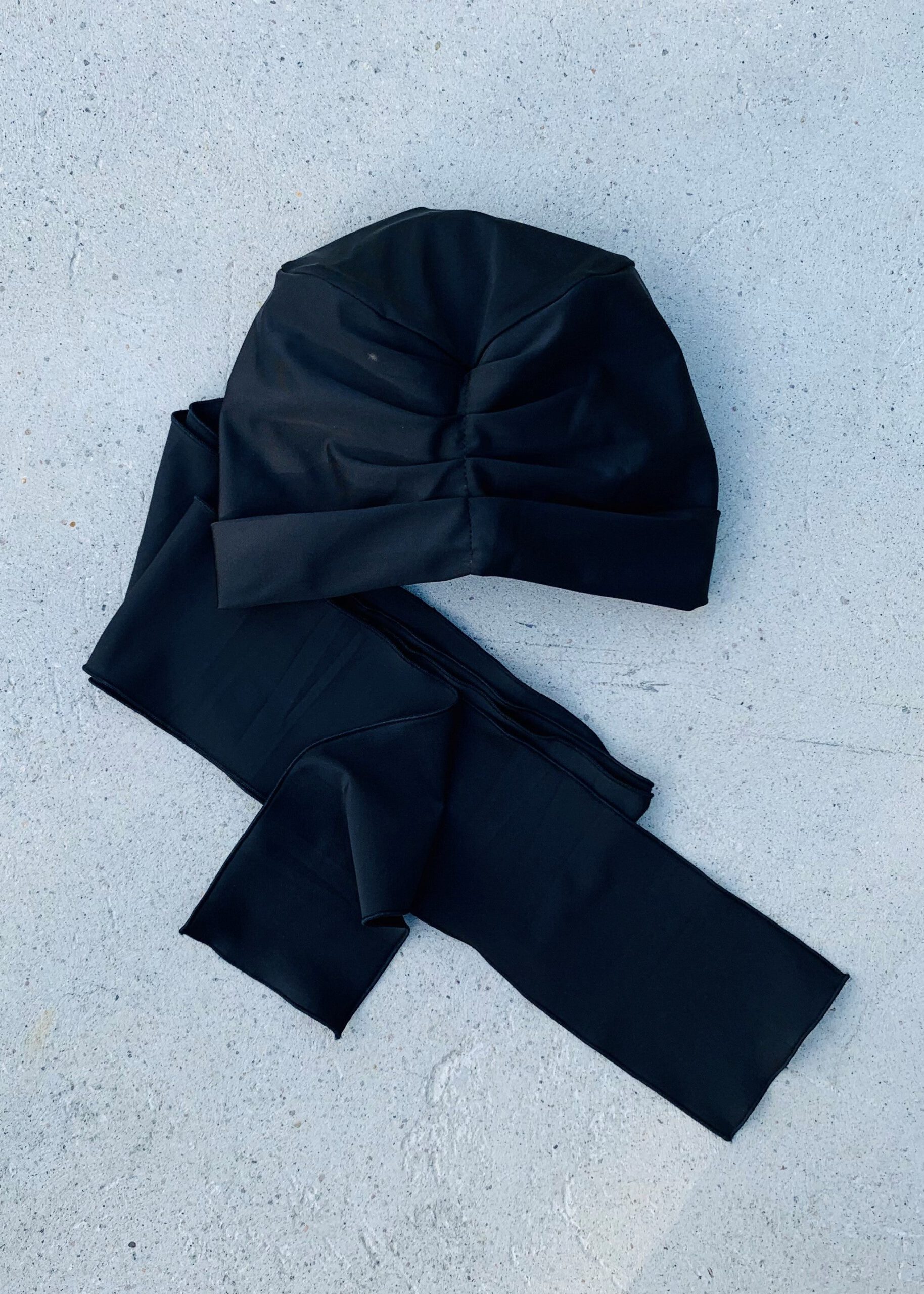 - Versatile self-tie turban in Black, crafted from our signature 4way stretch, ultra lightweight dry-fit fabric which is breathable, sweat releasing and quick-drying; perfect for swimming and the most active workouts.