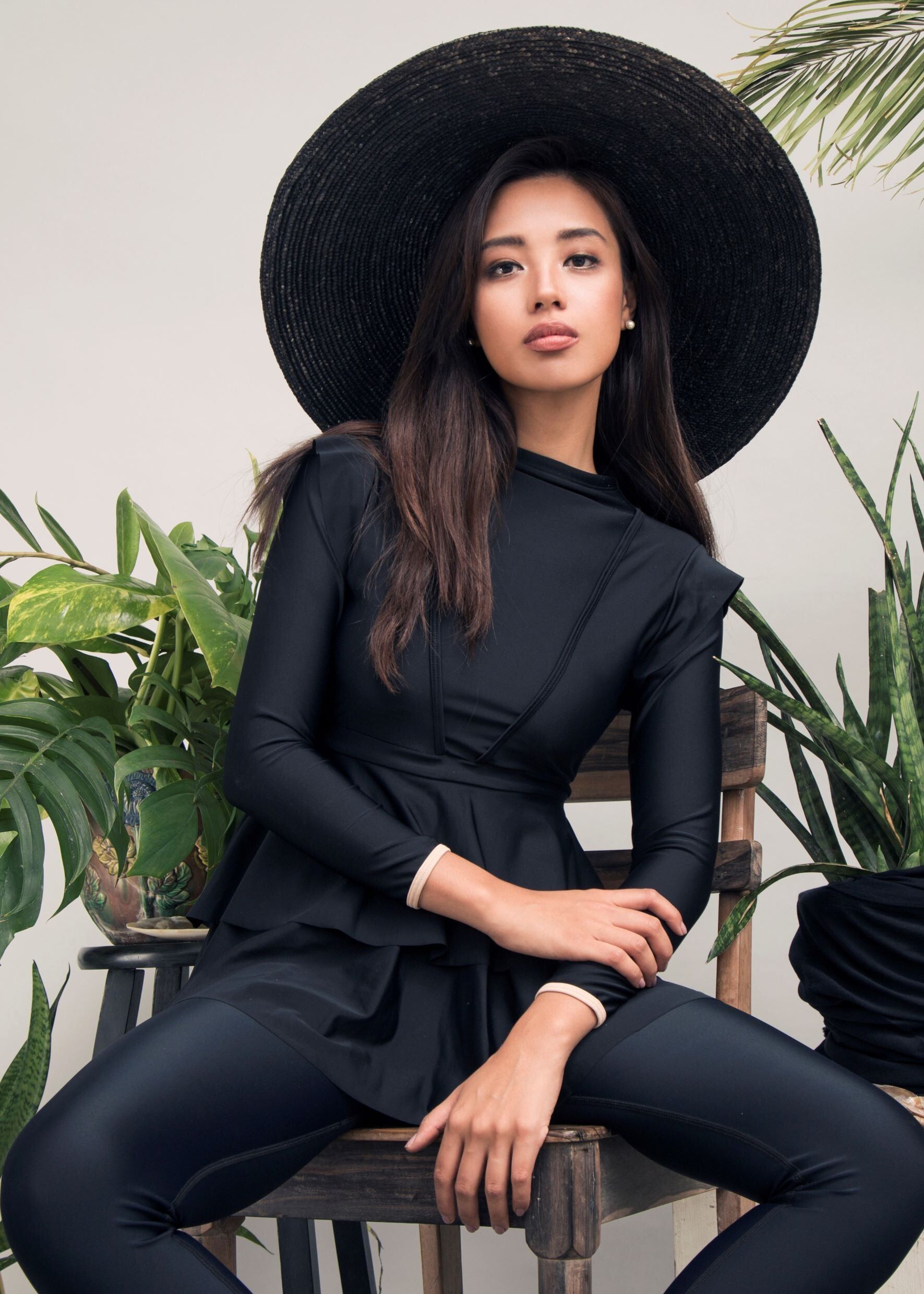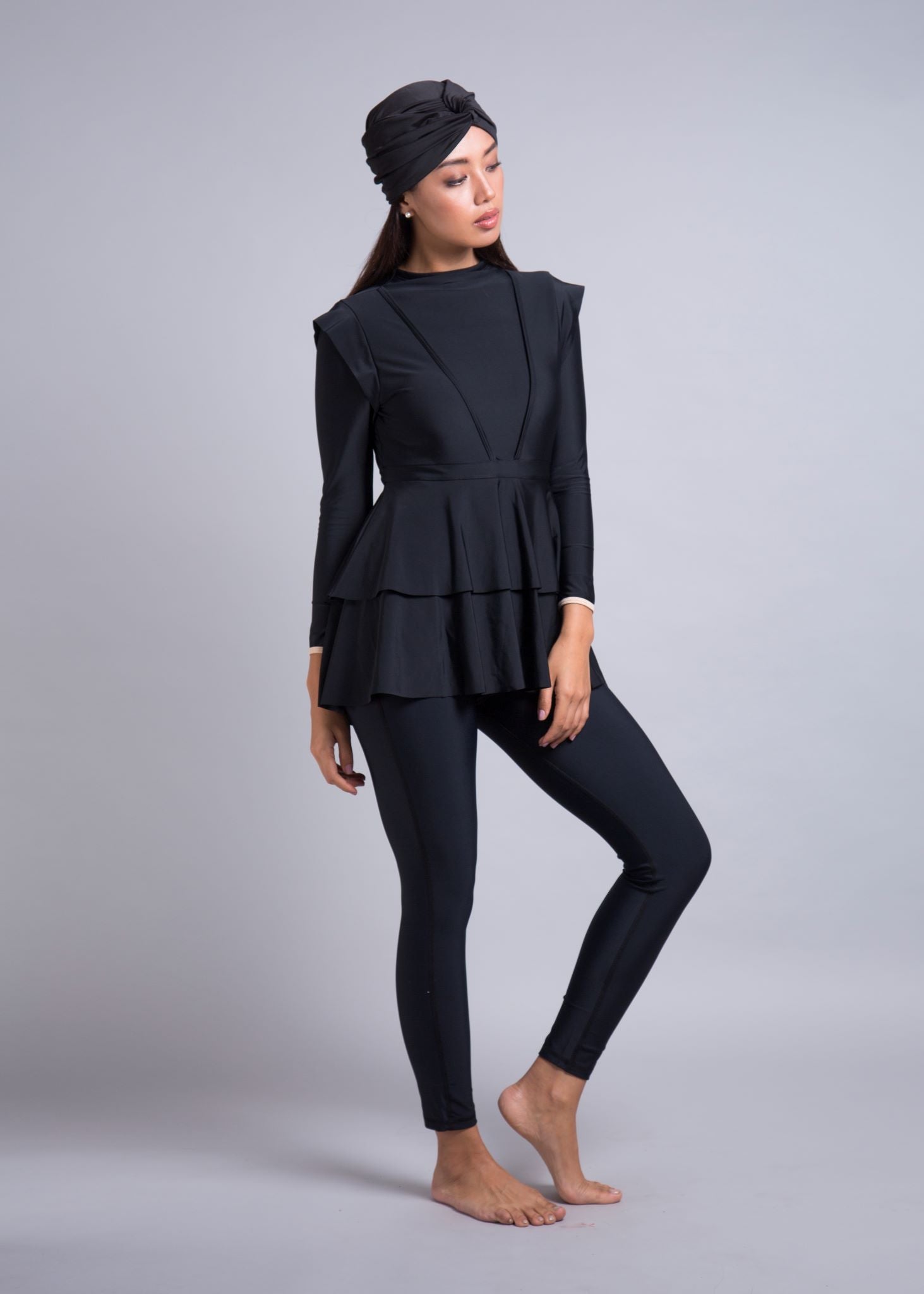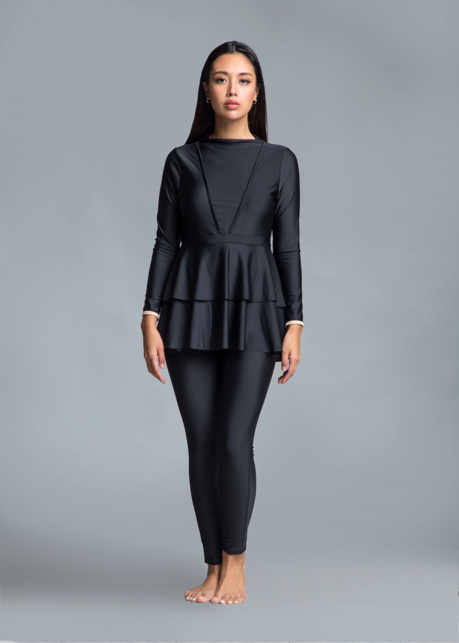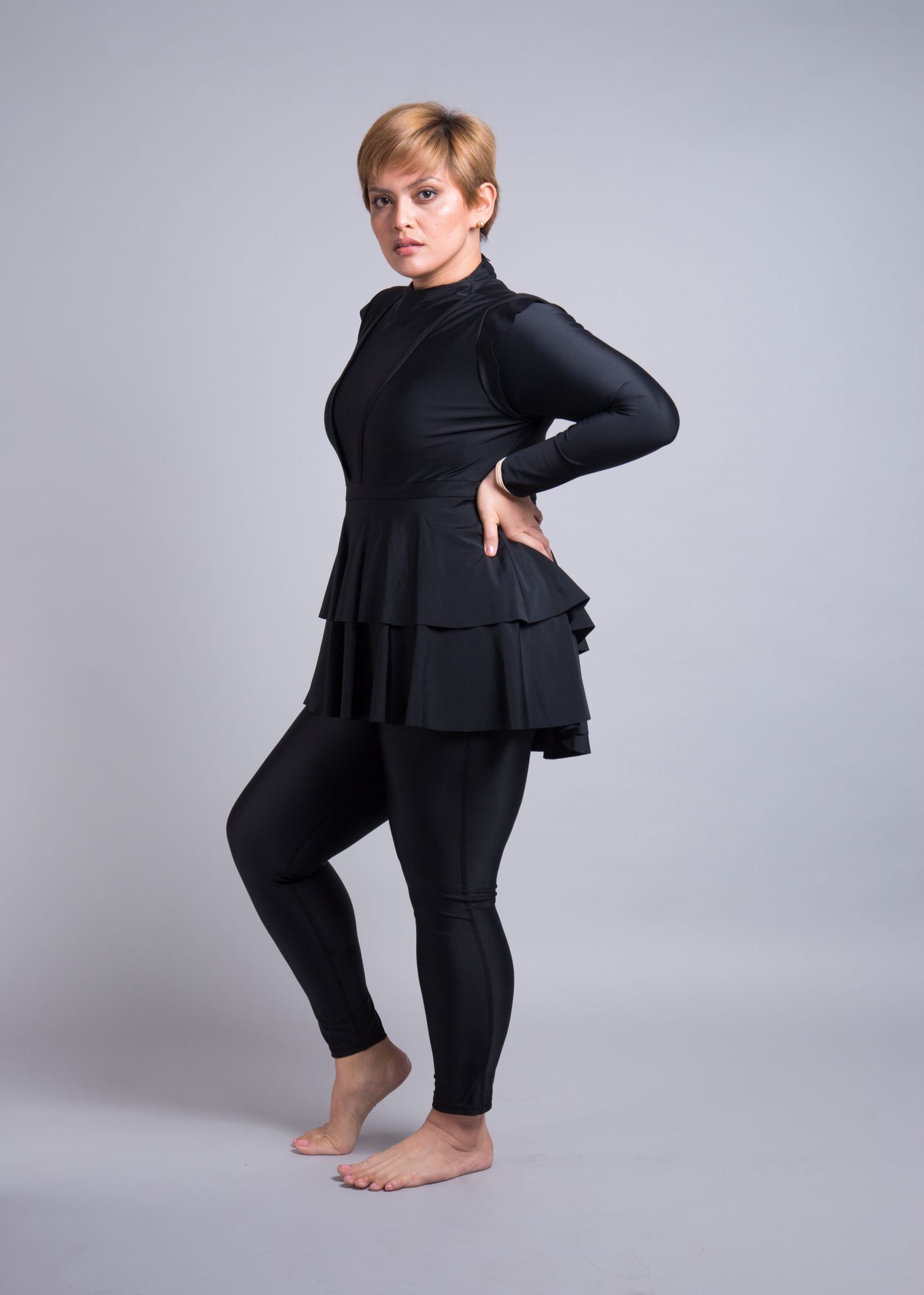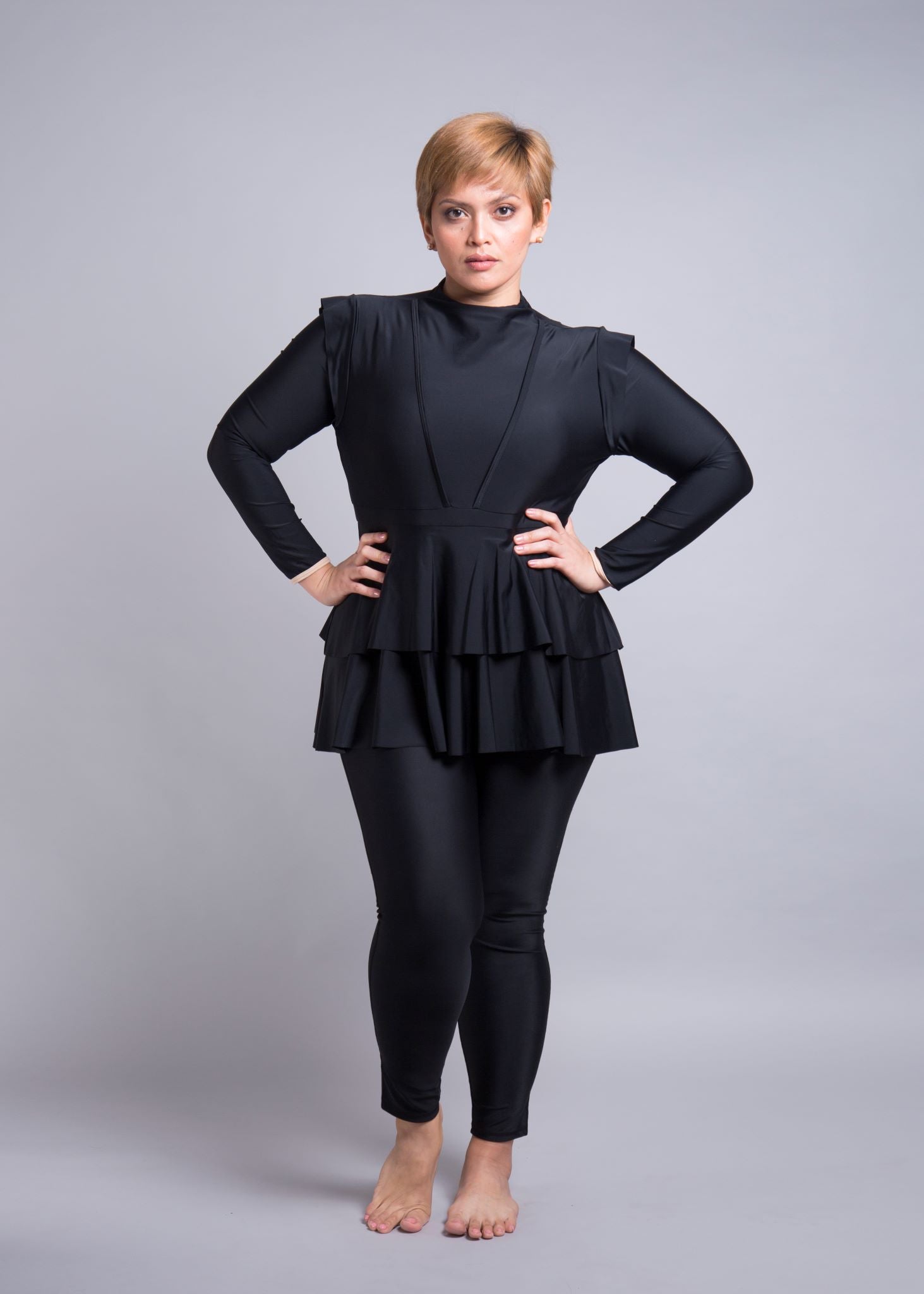 The double peplum layer starts from the waist and cascades down to your thighs, creating the illusion of a looser fit, whilst actually giving you the full support of a one-piece swimsuit underneath. It instantaneously gives you an hour-glass figure and the capped sleeves frame your arms with another feminine touch. For an average 5’5” woman with her arms placed on her thighs to the side, the Serena’s final peplum falls to the end of her thumb at the front and cascades longer towards the rear and falls to the ends of her fingertips.