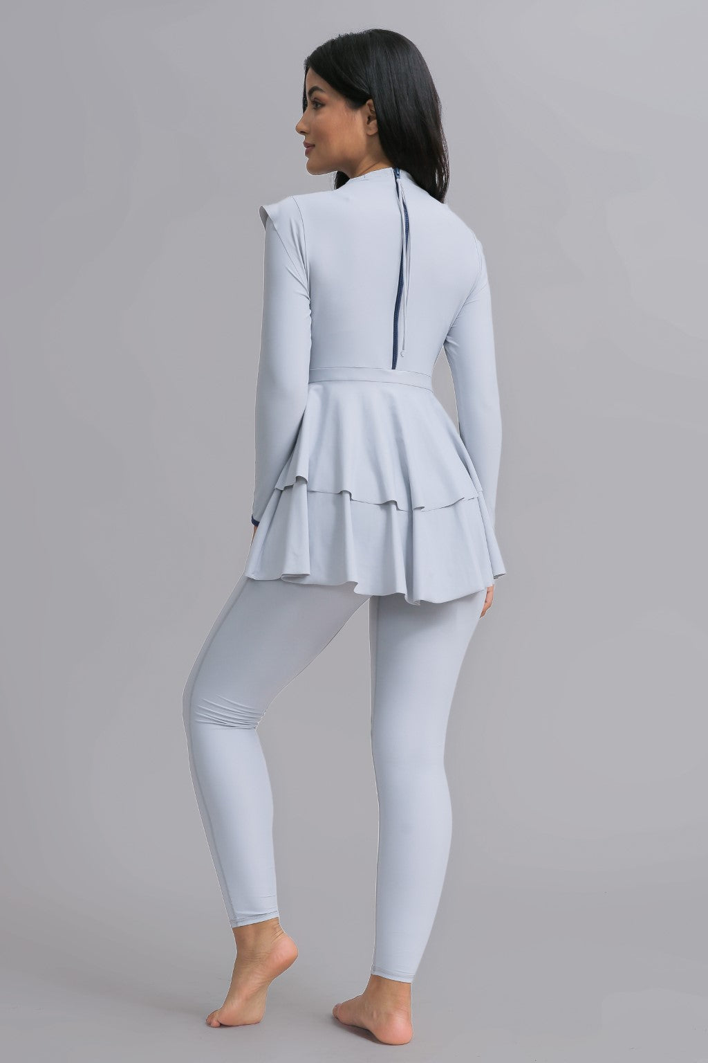 The double peplum layer starts from the waist and cascades down to your thighs, creating the illusion of a looser fit, whilst actually giving you the full support of a one-piece swimsuit underneath. It instantaneously gives you an hour-glass figure and the capped sleeves frame your arms with another feminine touch. For an average 5’5” woman with her arms placed on her thighs to the side, the Serena’s final peplum falls to the end of her thumb at the front and cascades longer towards the rear and falls to the ends of her fingertips.