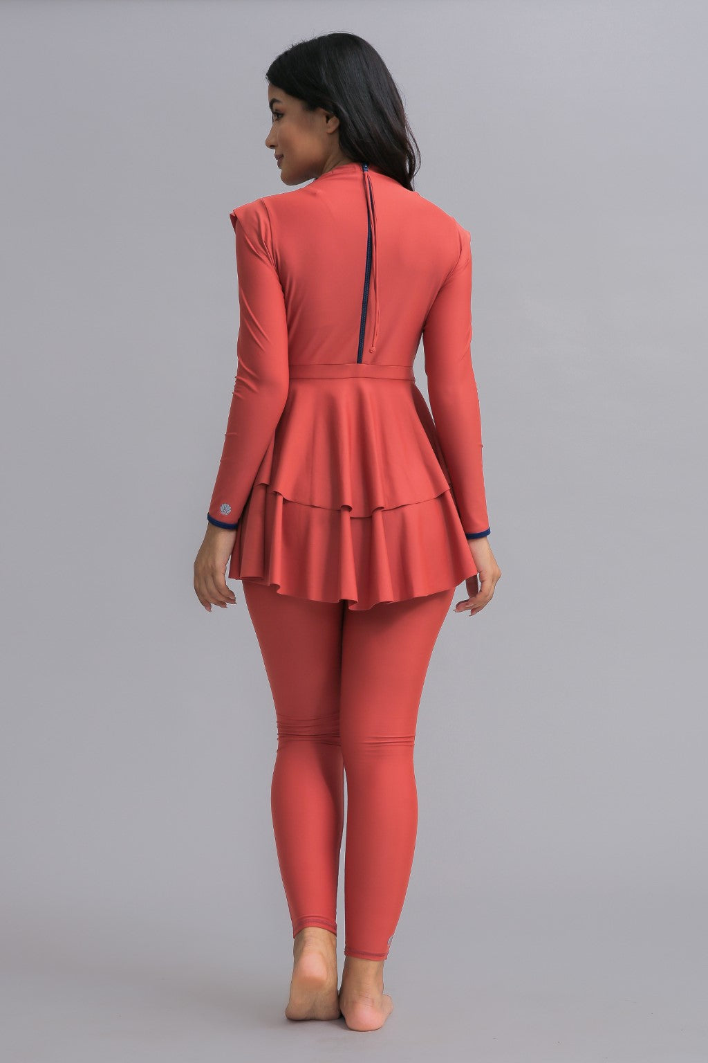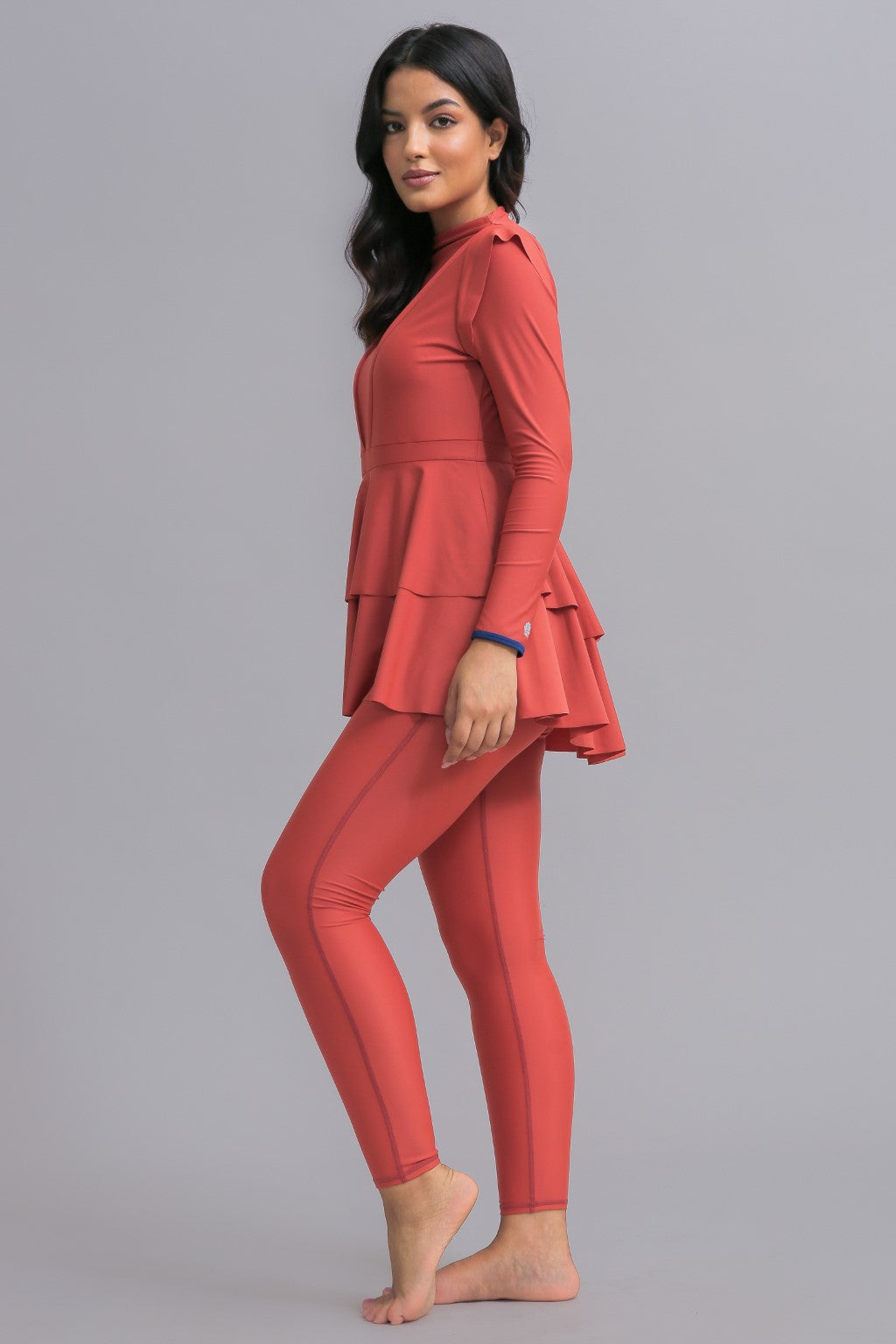 The double peplum layer starts from the waist and cascades down to your thighs, creating the illusion of a looser fit, whilst actually giving you the full support of a one-piece swimsuit underneath. It instantaneously gives you an hour-glass figure and the capped sleeves frame your arms with another feminine touch. For an average 5’5” woman with her arms placed on her thighs to the side, the Serena’s final peplum falls to the end of her thumb at the front and cascades longer towards the rear and falls to the ends of her fingertips.