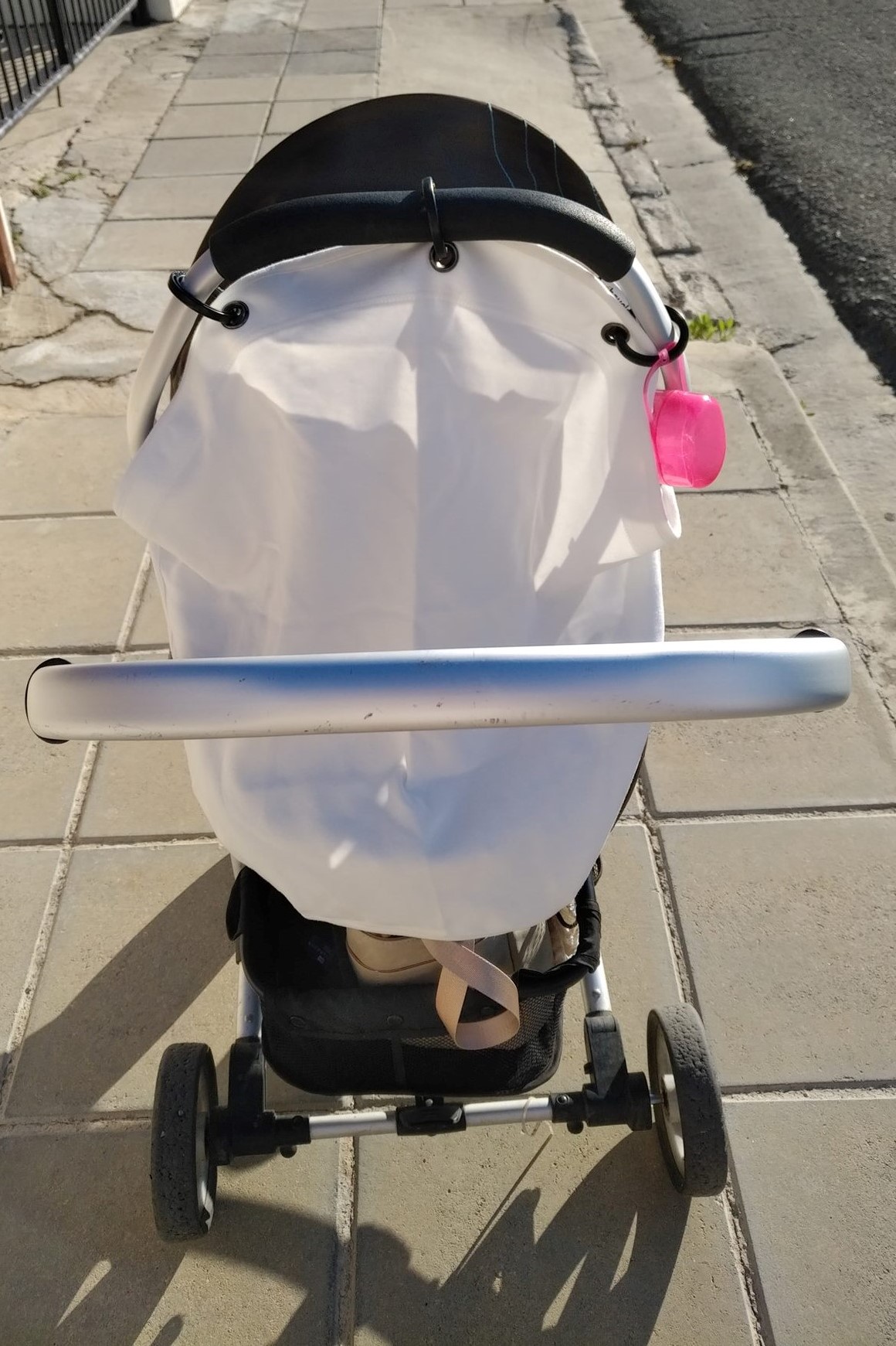 The ring attachment enables you to slide the curtain sideways to provide the coverage you need for your child. You can easily check on your baby at any time. The strings on the sides can be used to fasten the curtain when it´s windy. On hot days you can use the product as a sun canopy (see images). You attach the pram curtain to the handlebar of your pram with the two separate rings that are included.