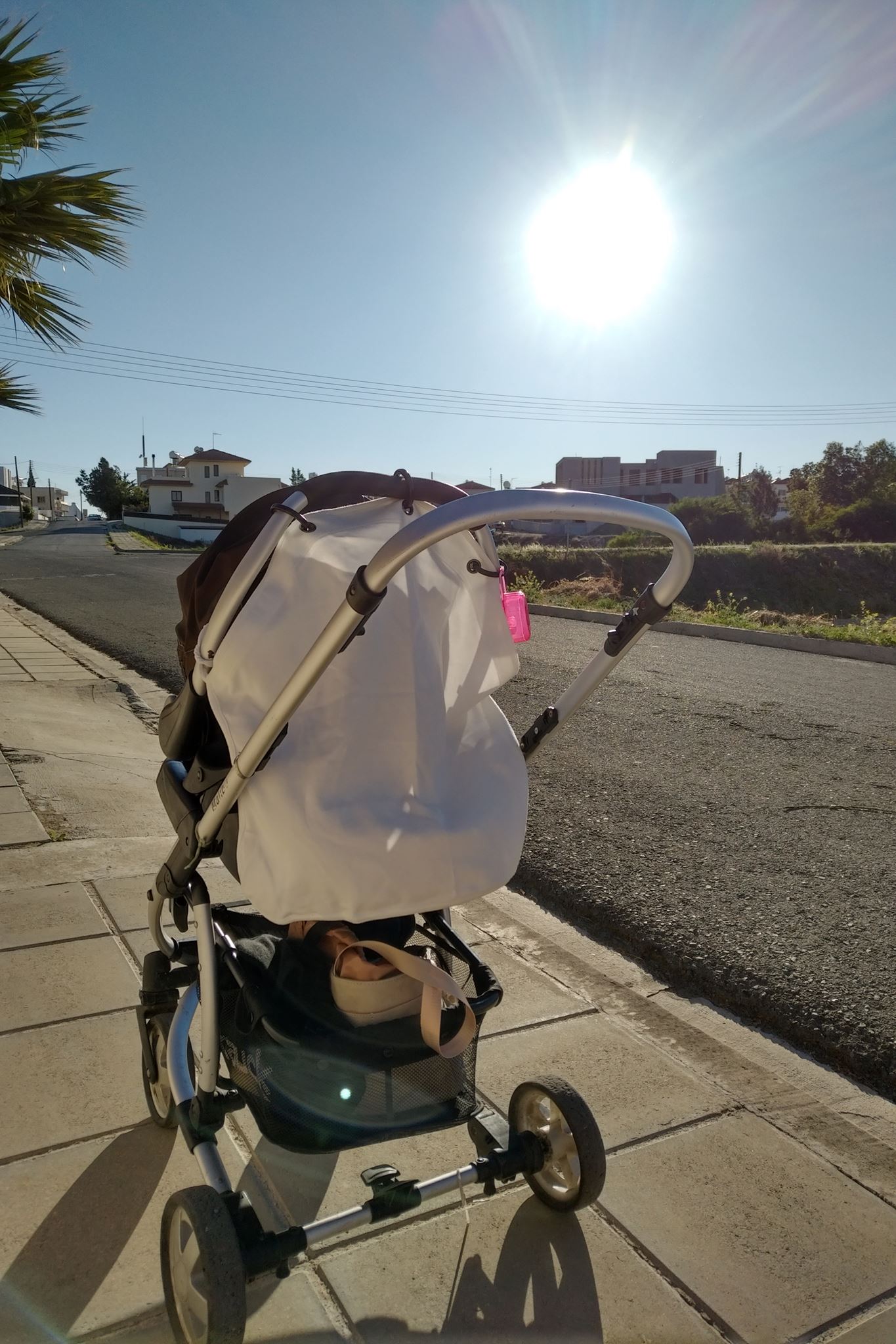 Never totally cover your pram. This is especially important in a hot climate as it will increase temperatures and decrease air circulation, this will cause danger to the baby inside the pram. On very hot days always stay in the shade. Remember never to leave your baby unattended and always ensure there is good air circulation.