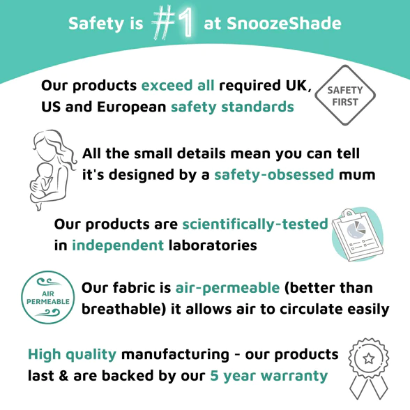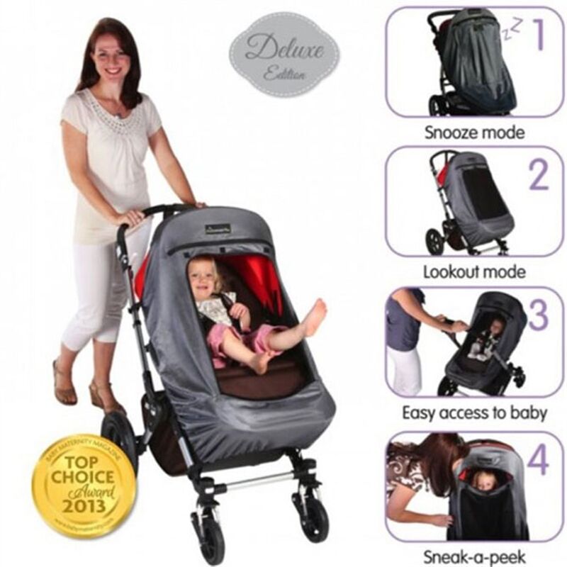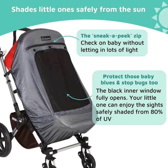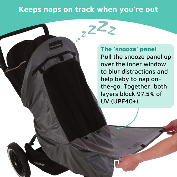 Crafted with luxurious silver-grey mesh fabric and adorned with a sleek black trim, the SnoozeShade Plus Deluxe incorporates the use of baby-safe certified poppers, ensuring the utmost safety for your child. With the ability to shield your little one from up to 97.5% of harmful UV rays, this shade is perfect for maintaining their nap routine on the go.