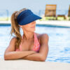 This hat is excellent for trips to the pool or sailing excursions, the Aqua Visor will keep you comfortable. Its quick-drying fabric lets you enjoy any water activity without leaving your hat behind. Adjusts to any size with a tie in the back. 4" brim. 100% Lycra. Handwash cold. Extra Wide Brim. Packable. Water Resistant.