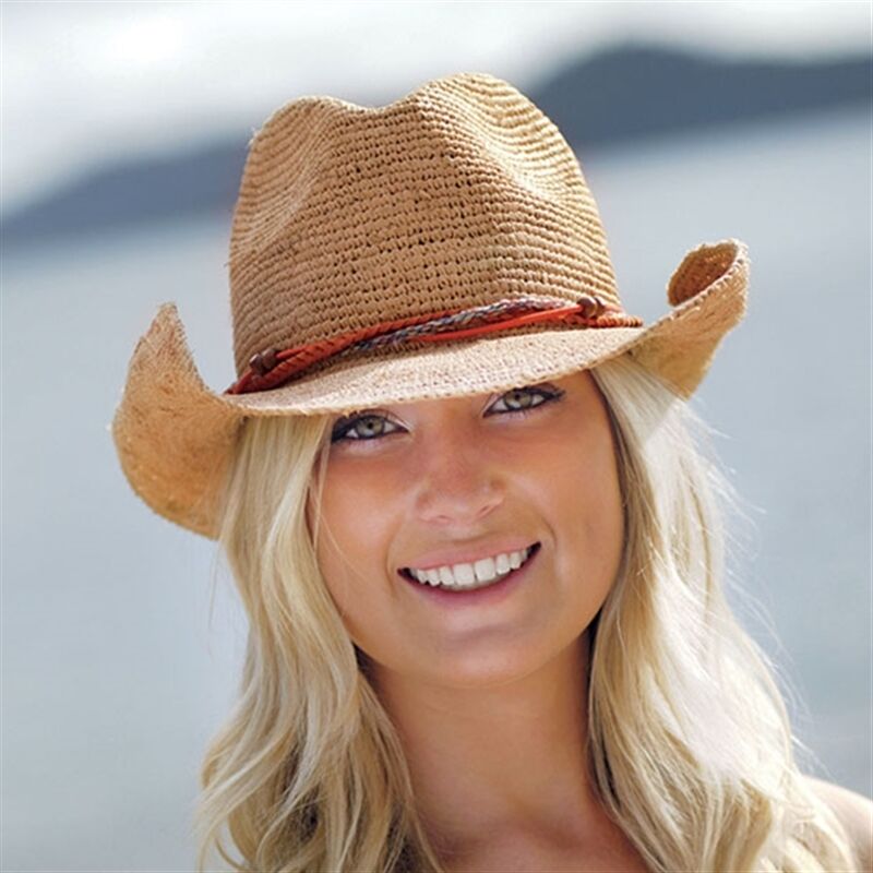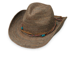 Wallaroo's cowgirl hat is ready to ride with a 3" wire-edged brim for perfect shaping and an artsy mix of leather, colored string and beads.You'll be awarded "best in show" everytime you wear it. Internal drawstring for a custom fit. 100% raffia. Do not wash. Wide Brim Ladies Hat