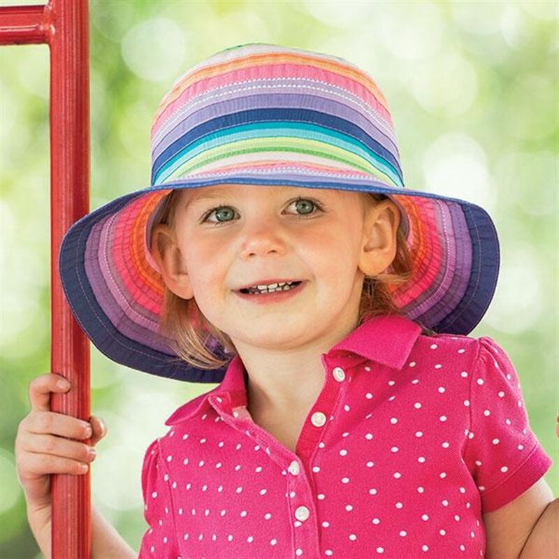Gorgeous brightly coloured ribbons are sewn together to create this light weight sunhat full of colour that little girls adore to wear. Travel friendly, crushable and packable.