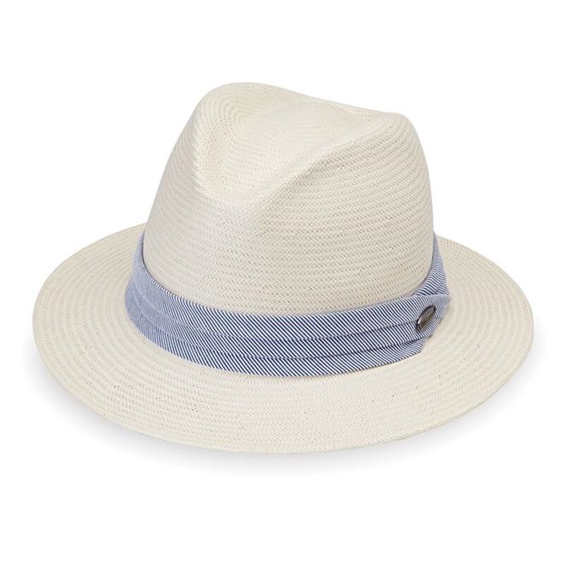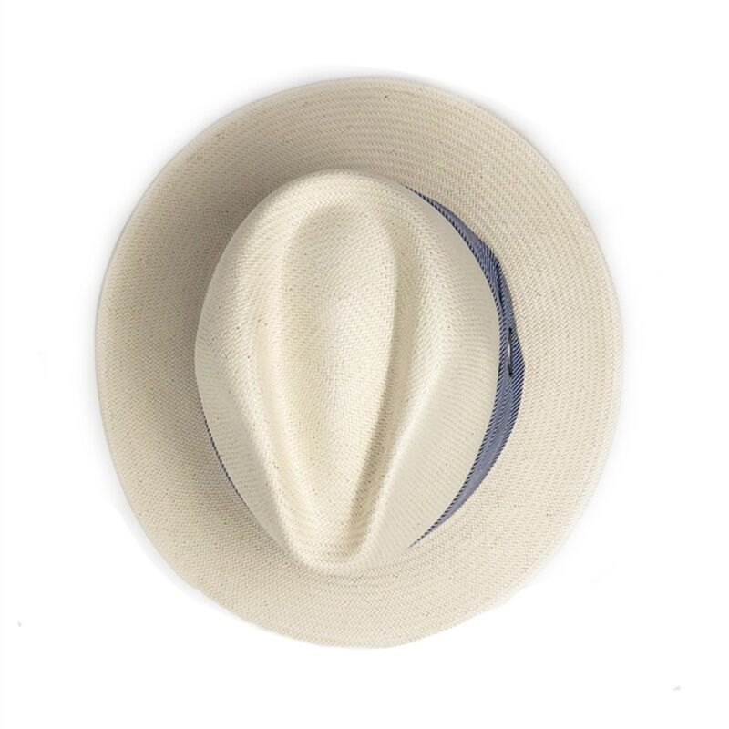 We love fedoras because they are so versatile. Try this one with jeans and watch an everyday look turn into a fashion statement. Blue and white pinstripe band at crown. 2 3⁄8" brim. Inner drawstring adjusts fit. Packing not recommended. 100% Japanese glazed paper exclusive of trim. Do not wash.
