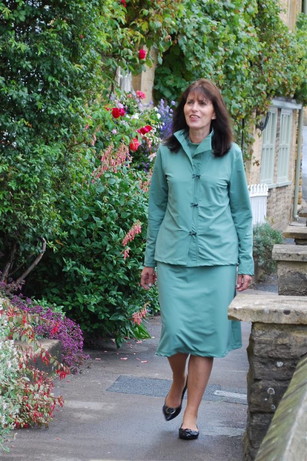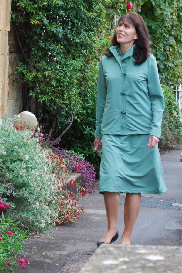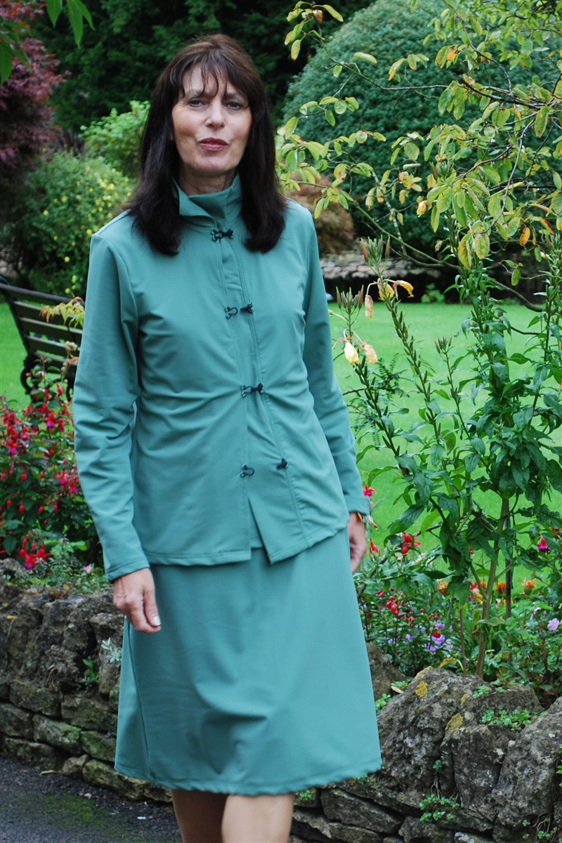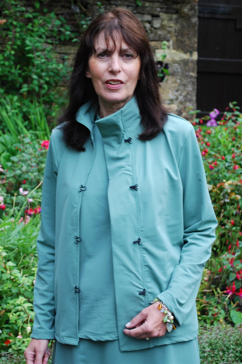 An elegant and flattering short box shape sun protective jacket with mandarin collar. The jacket has oriental hook and eye fastenings. Great as a second layer and to complete an outfit. Looks so smart.