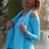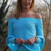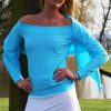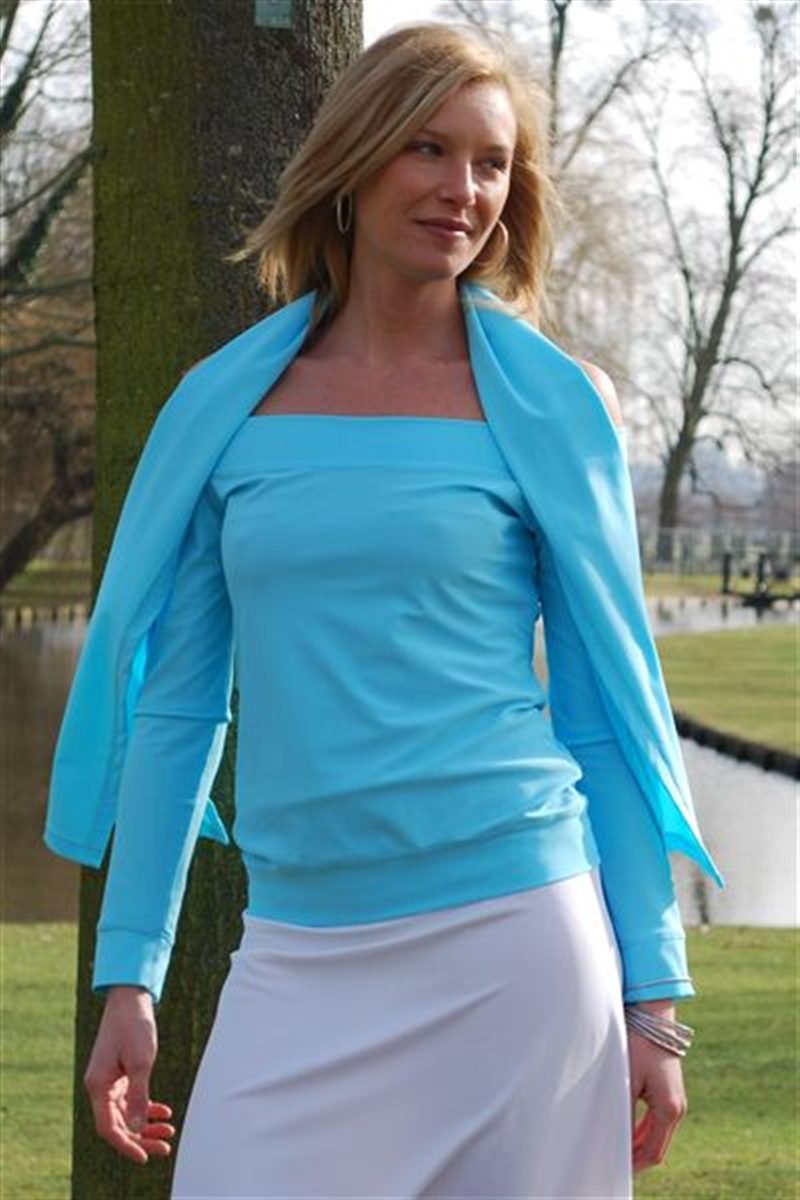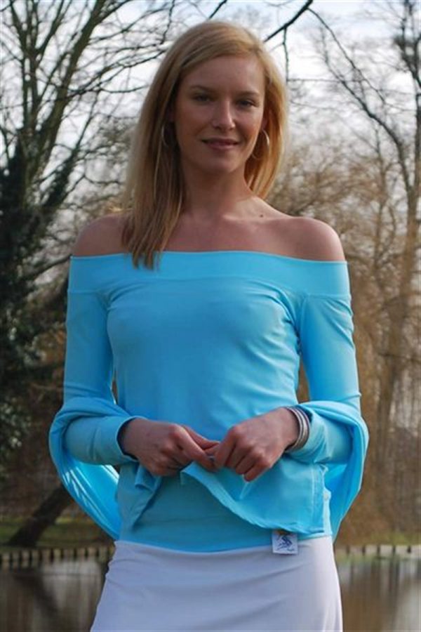 Off the Shoulder Sun Protective Top, Complimented with wide bands on neck line, wrists and Hem. Great for any occasion but dont forget the suncream on the neck & shoulders ... Available in Laguana Size 12