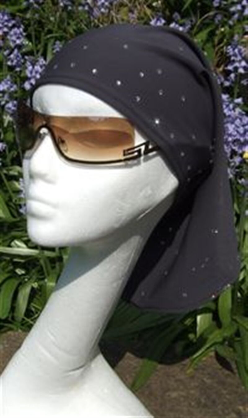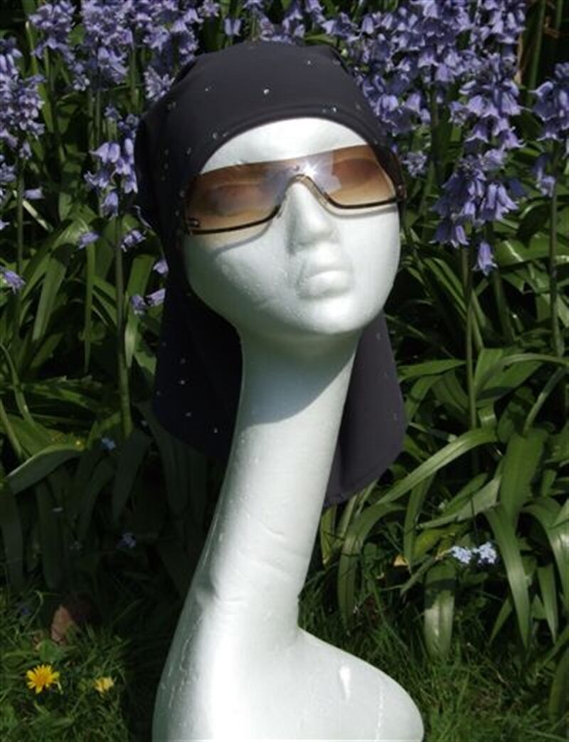 Head Loop 40cm x 25 cm tube of sun protective fabric that can be worn as a neck scarf, face mask, & to prevent UV rays. Head and Face UV sun protection Sun protection for hair and scalp Machine Washable, Chlorine Resistant, Quick Drying and Breathable Fabric. Image is shown here with bespoke diamante finishing this is a bespoke service. The item shipped will be absolutley plain with NO decoration. You can enquire about diamantes but this will add to delivery time and there will be an additional charge.
