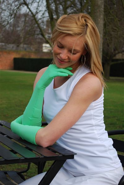 Adult glove lengths are based on Short - 2”/5cm Medium 10”/25cm Long 16”/40cm. Toddlers and kids are scaled down accordingly. Please get in touch if you have any questions, we are here to help This garment is pictured here in the colour : Spring Green ( Bright Green ) but available in SABBIA MEDIUM LENGTH LARGE SIZE- Swatch shown.
