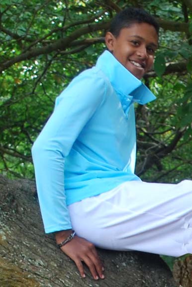Long Sleeve Polo Shirt, suitable for all teens. Long sleeves keep arms protected with an UPF 50+. Polo shirt style neck keeps the item classic and fashionable. Standard design comes with matching colour fabric buttons but can also have our SunSibility clear buttons as shown on request. Please specify this at point of order.