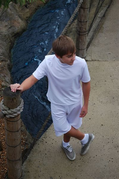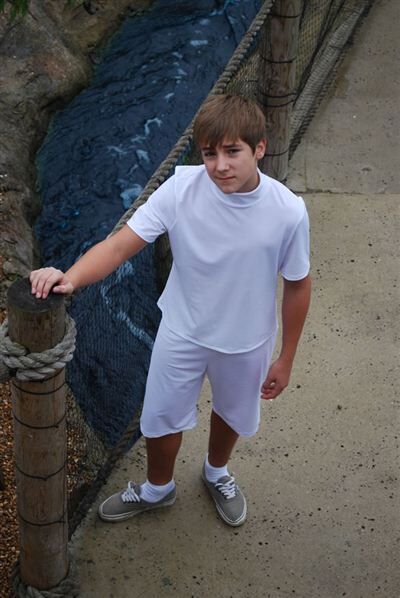 Teenage Turtle Neck Top, both boys and girls alike can wear this high neck item. The high collar design covers the sensitive neck and keeps it protected. Short sleeves keep the shoulders and upper arms protected. Dress with Drawstring trousers for a summery outfit. Machine Washable, Chlorine Resistant, Quick Drying and Breathable Fabric. This garment is pictured here in the colour: Bianco(White)