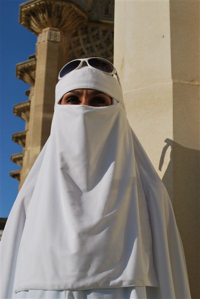 Sun Protective cover for the face with opening for eyes. Ties at back of head. Face UV sun protection This garment is pictured here in the colour: Bianco(White)