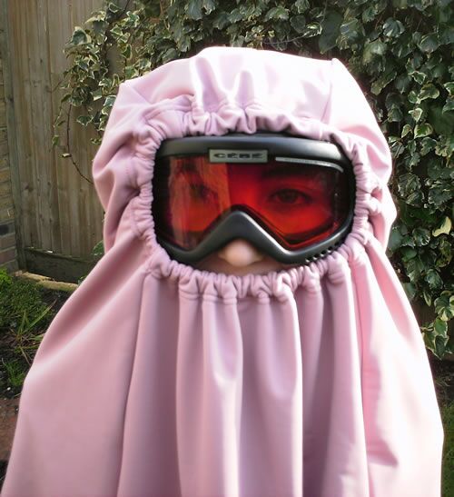 A sun protective face mask has been developed for those who have a severe reaction to sunlight and need to protect from UV Rays. Goggles are models own and have been clipped / sewn into the fabric on request.