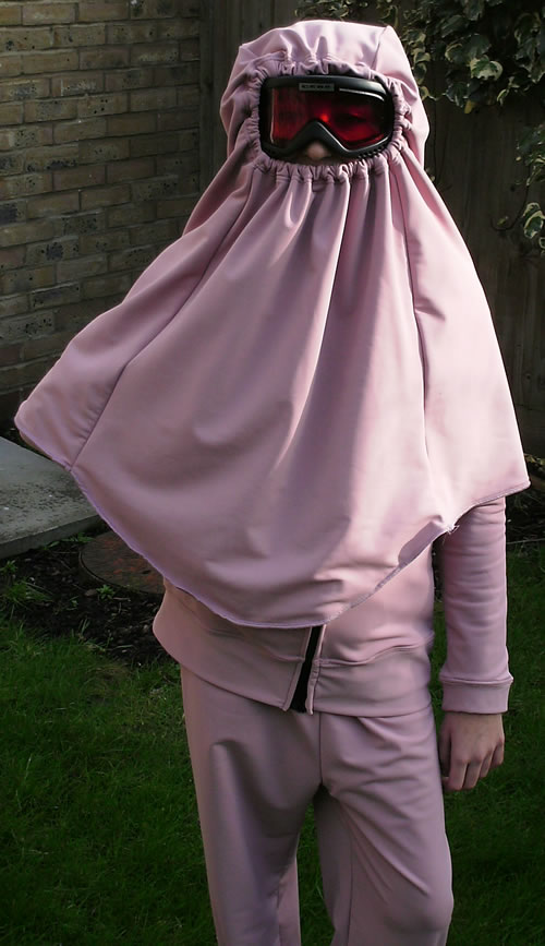 A sun protective face mask has been developed for those who have a severe reaction to sunlight and need to protect from UV Rays. Â Goggles are models own and have been clipped / sewn into the fabric on request.