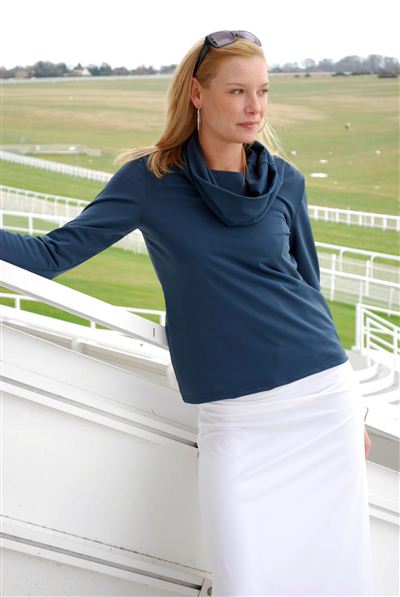A stunning sun protective cowl neck top Great long sleeve garment with graceful protection for the neck. This garment is pictured here in the colour: Ardesia(Navy)