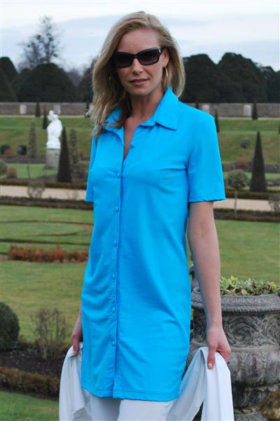 3/4 length sun protective shirt dress, ideal on its own or with drawstring trousers, short sleeve version is pictured.