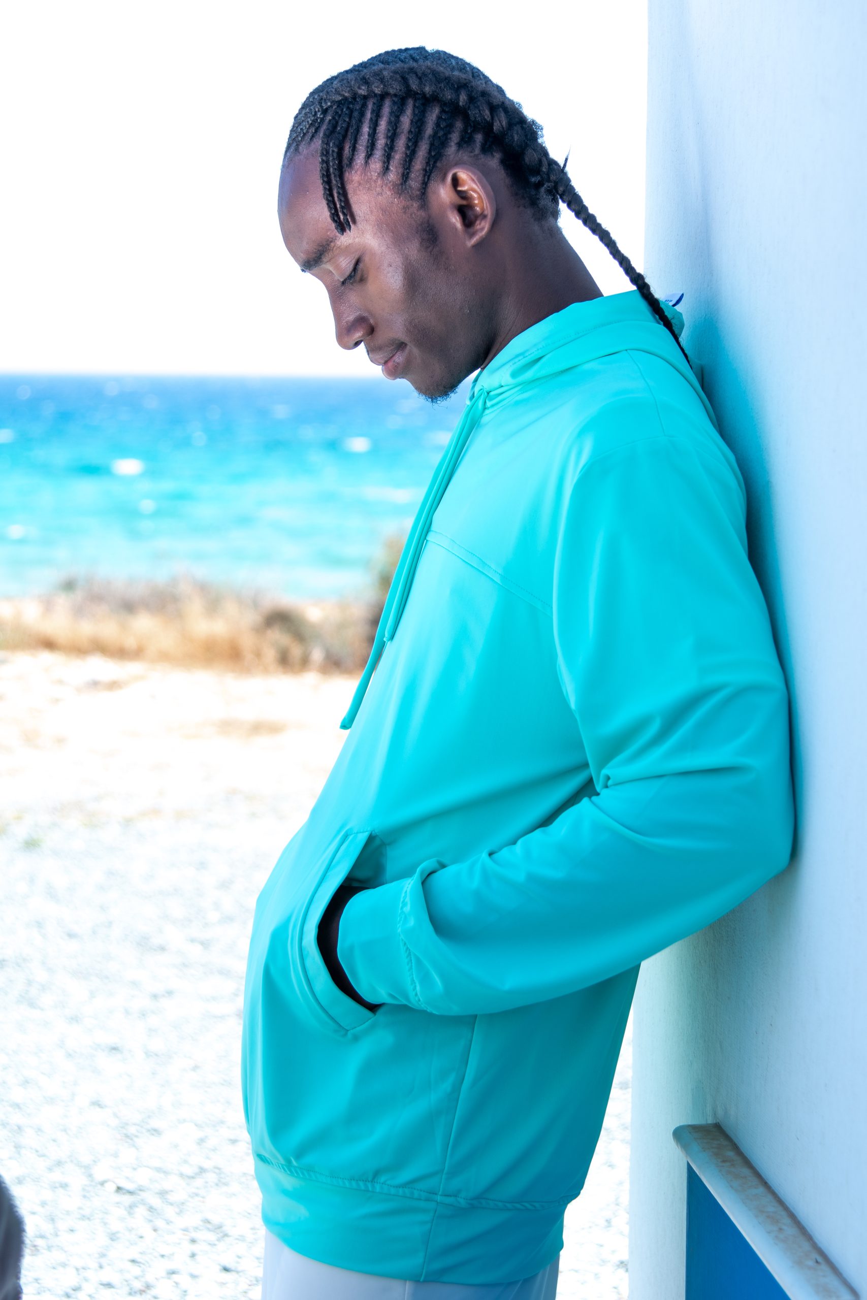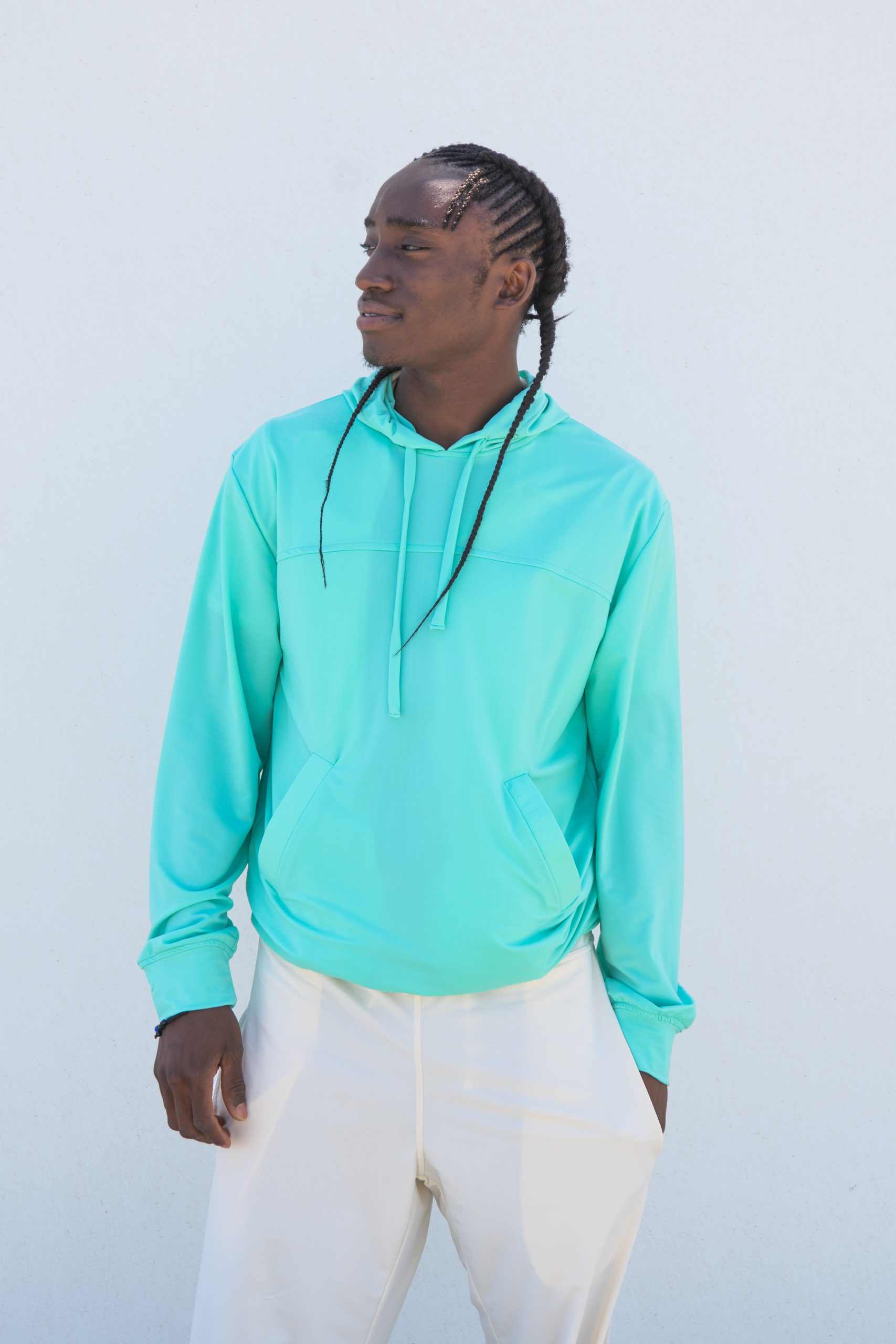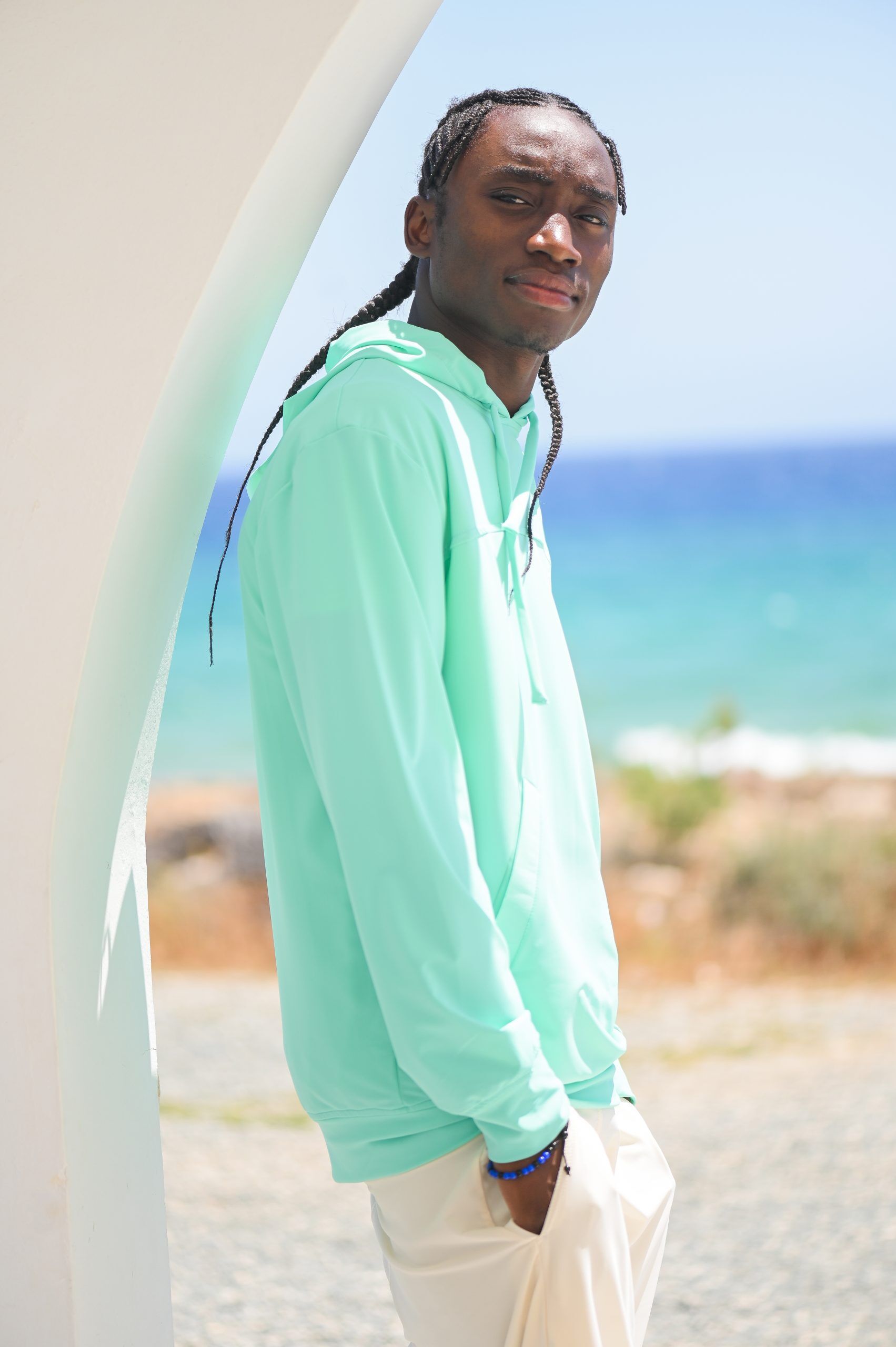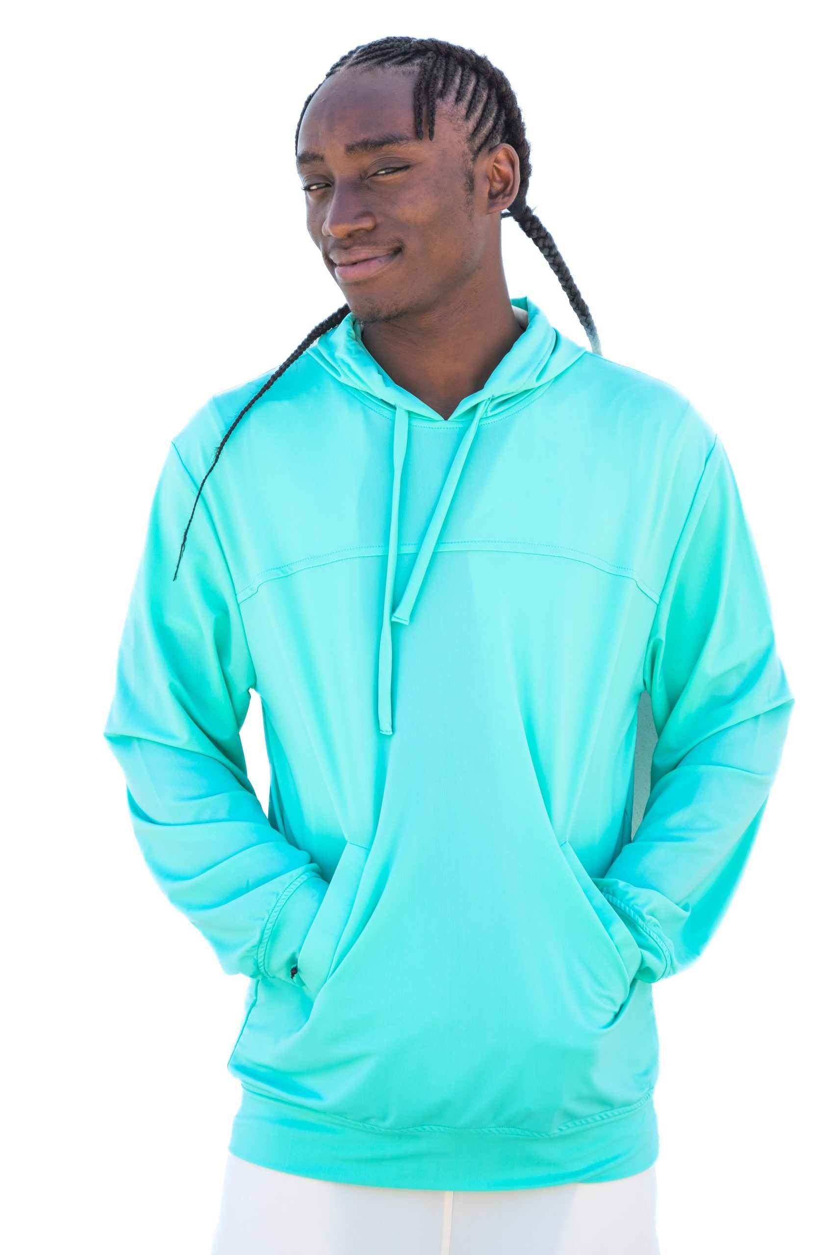 Mens Hooded Top with detail trim across the front & Side Pockets. Lovely design with attention to detail. This item can be doubled but please be aware may become quite heavy due to the amount of fabric. This Garment is pictured here in the colour: Oxygen ( Mint ) & Laguana (Bright Blue)