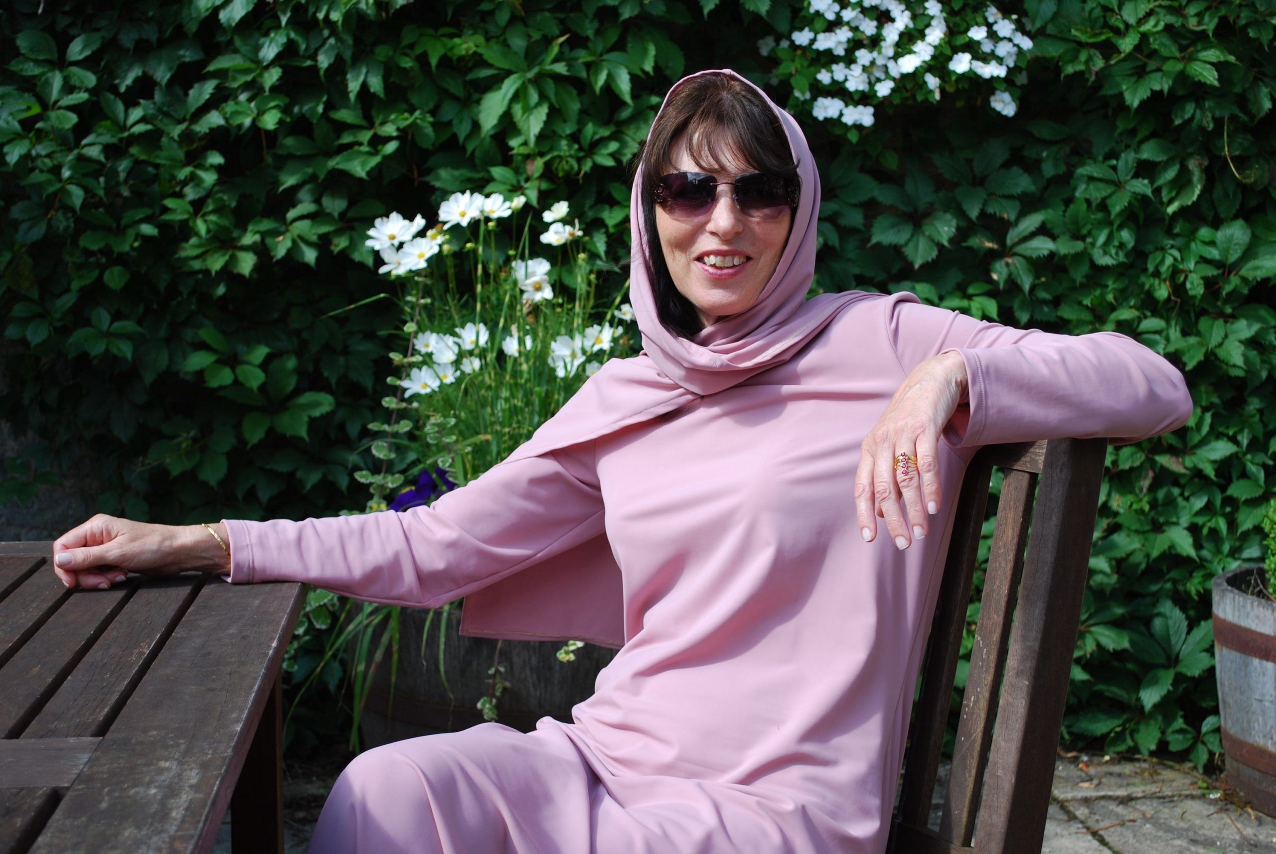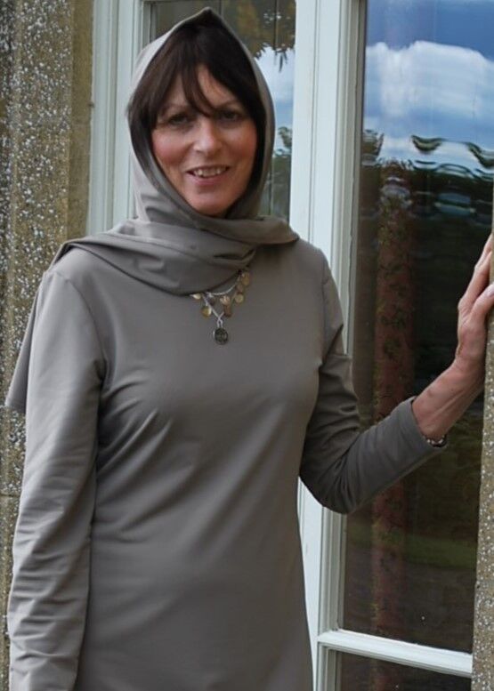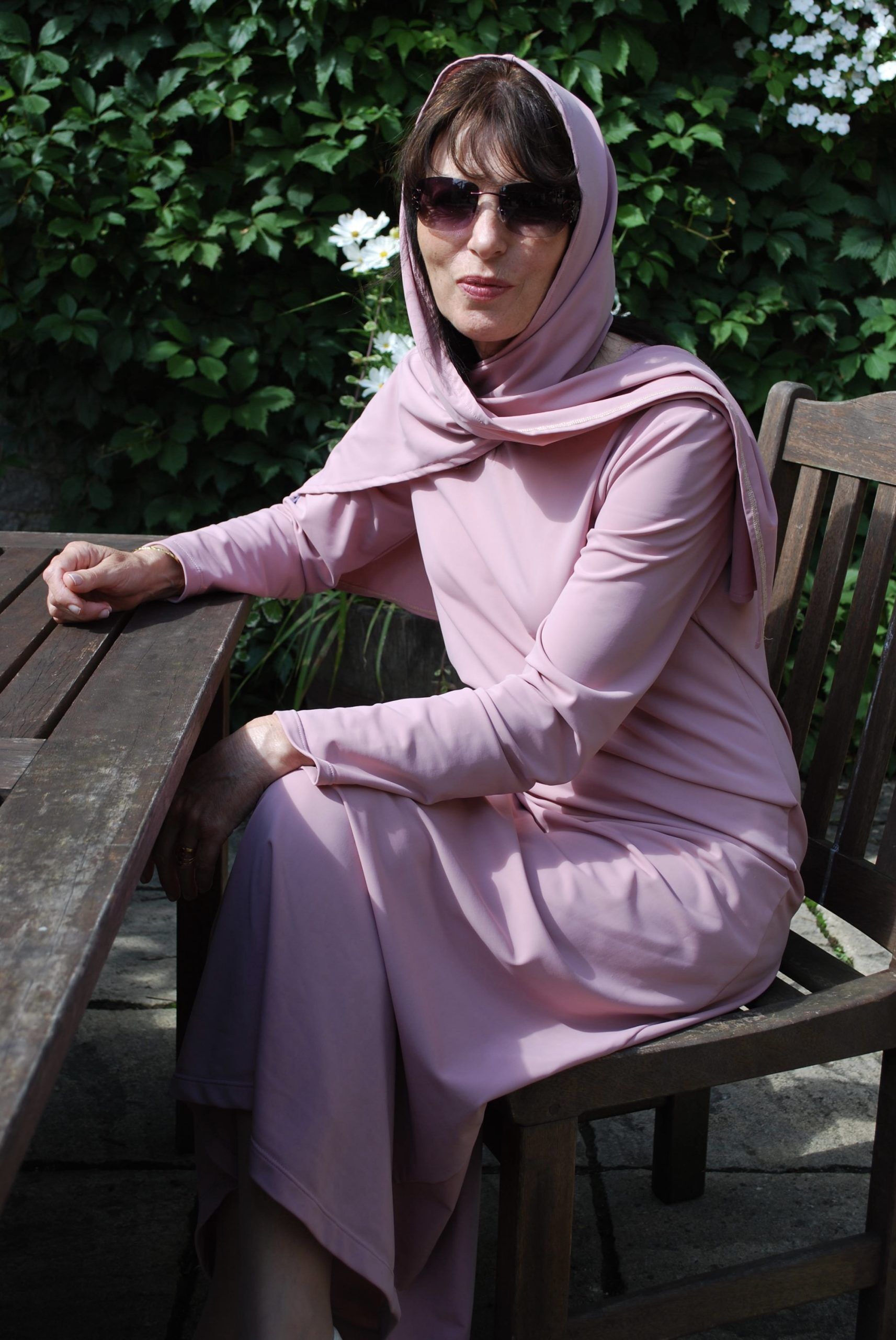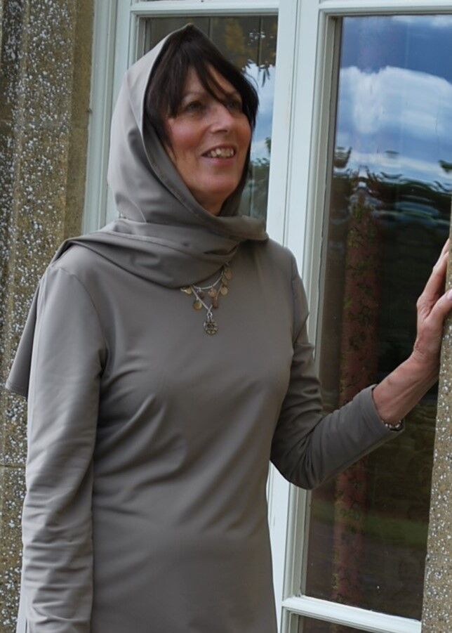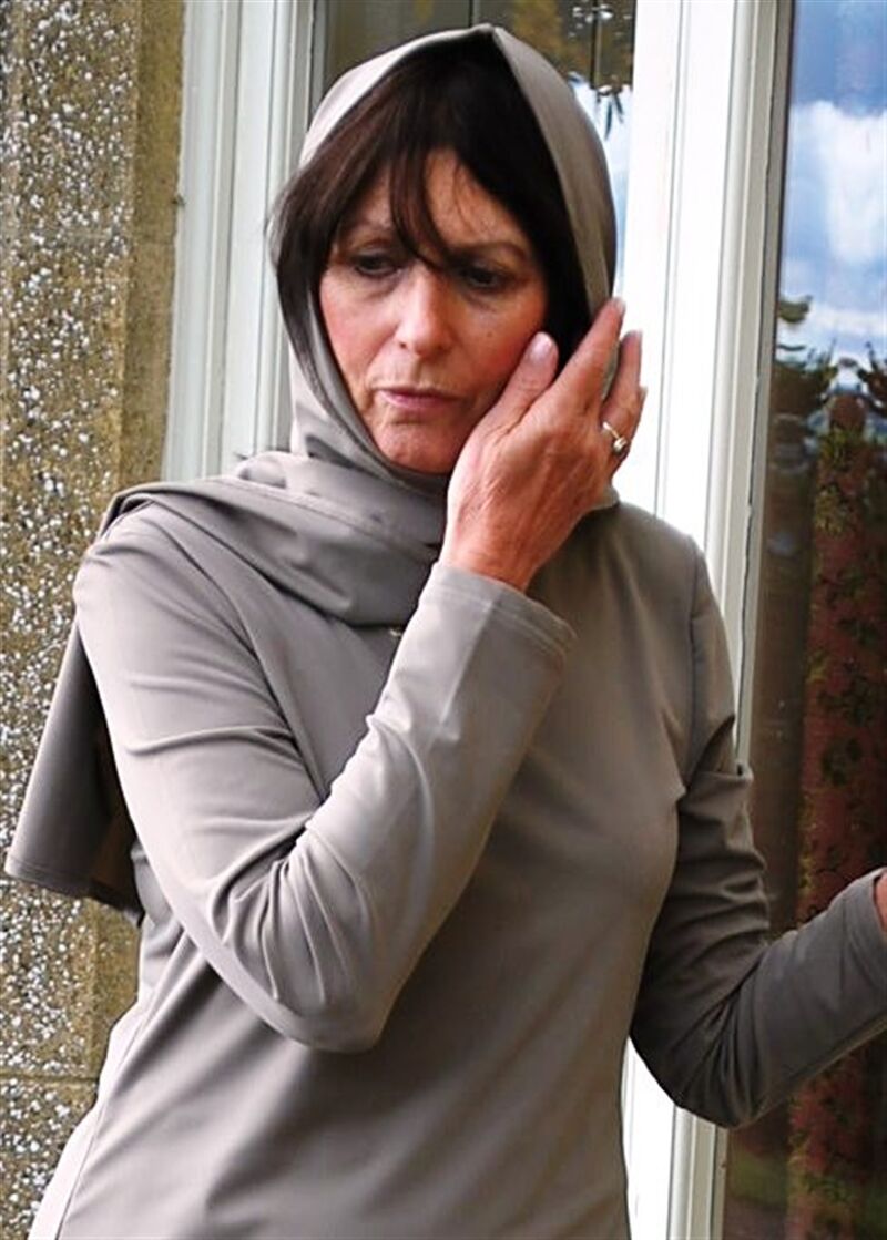 Scarf can be tied around neck & if required pinned to cover nose & mouth.