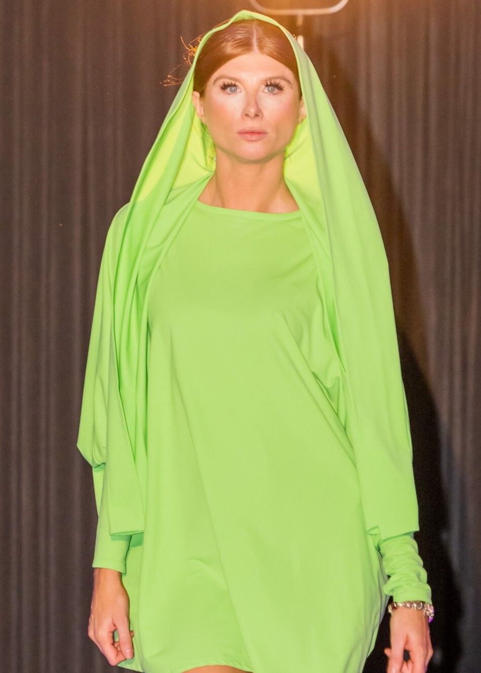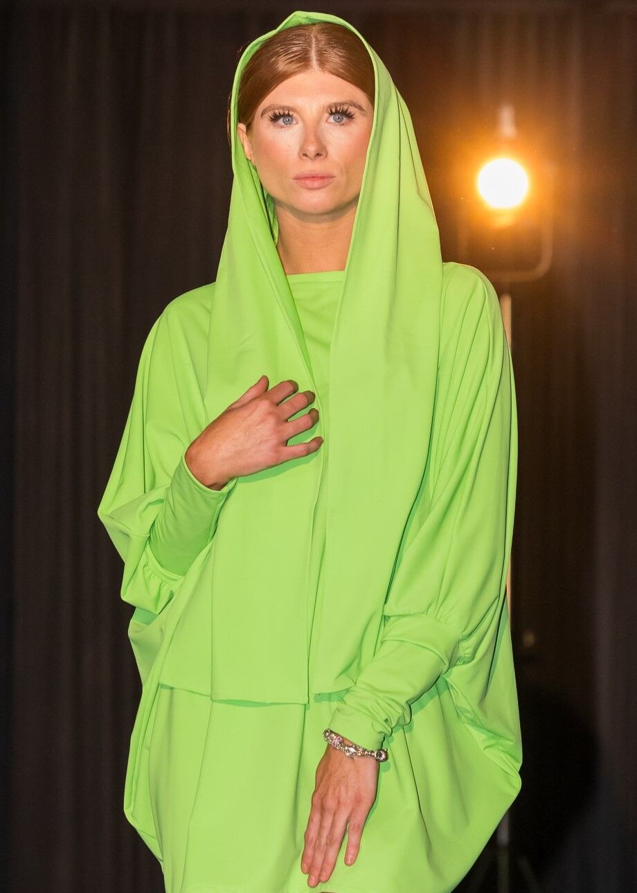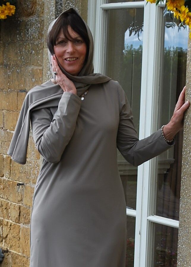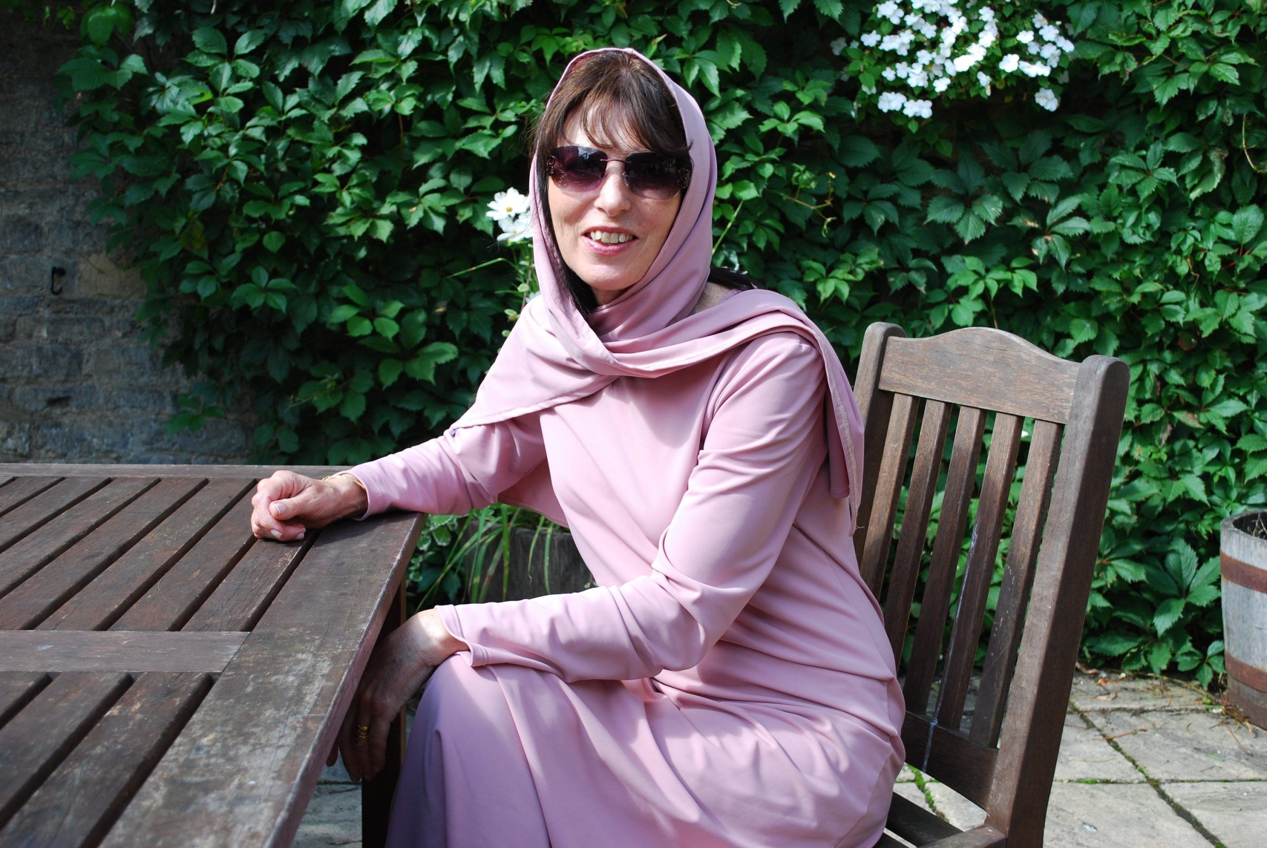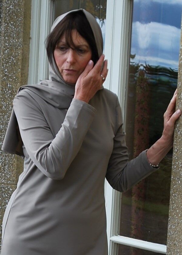 Scarf can be tied around neck & if required pinned to cover nose & mouth.