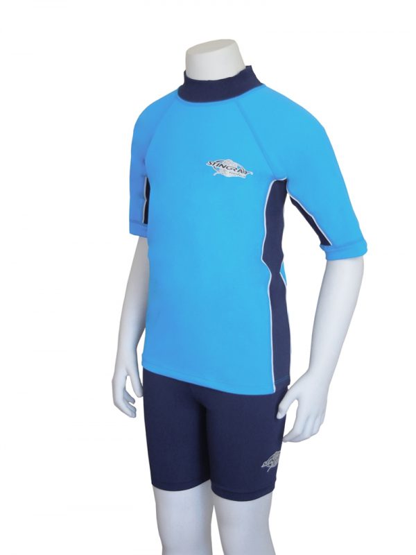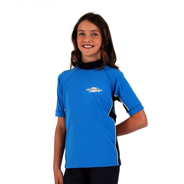 Rash shirt with short sleeves and high collar. The rash shirt is made from excellent Chlorine resistant fabric which is cool, soft, durable and quick drying with maximum sun protection factor - UPF 50+ which blocks > 97.5% of the suns UV radiation giving excellent UV protection.