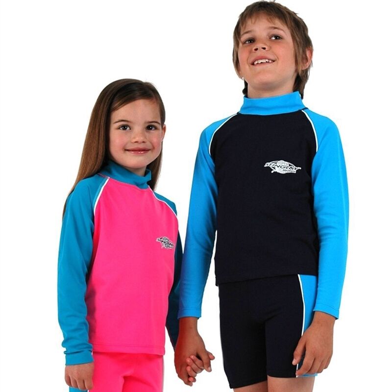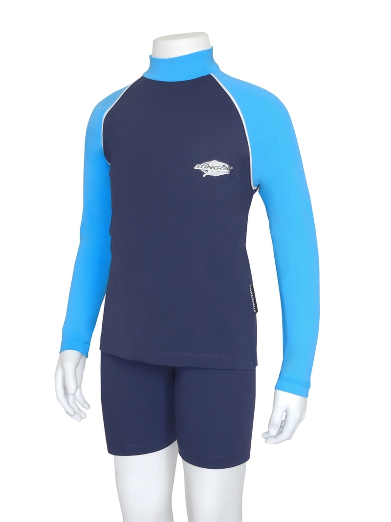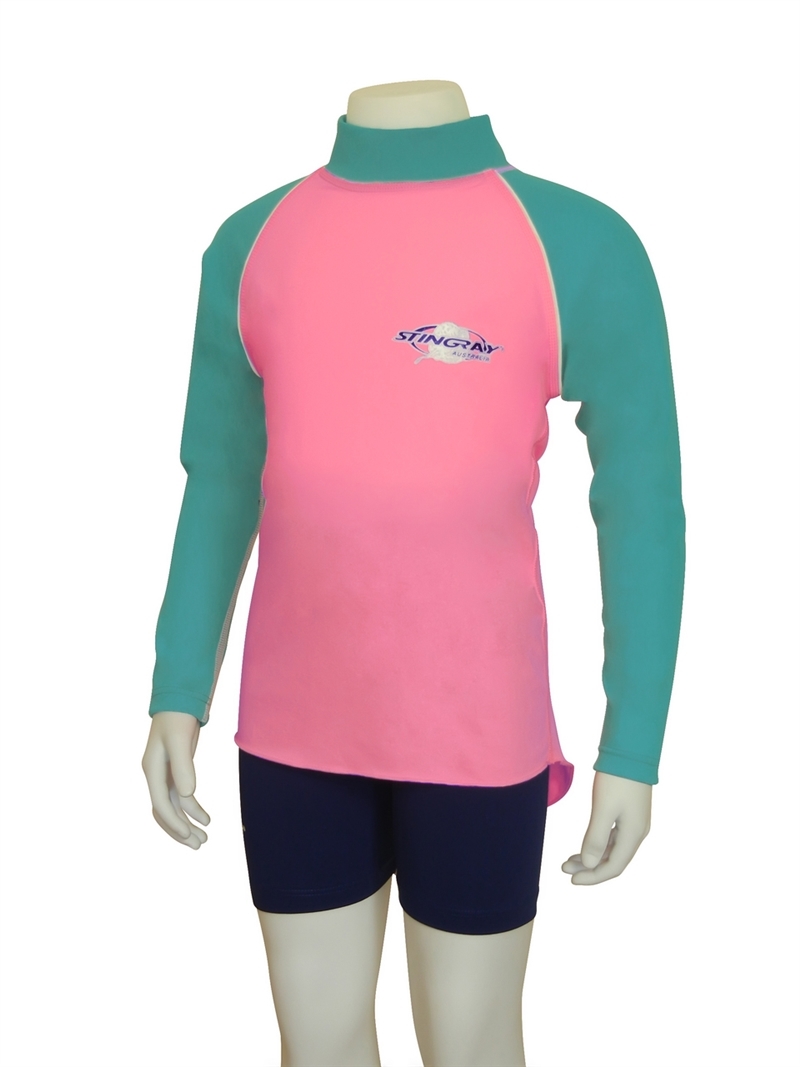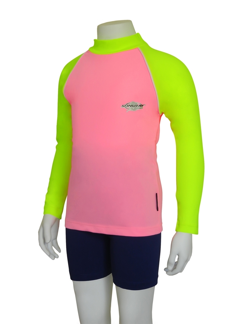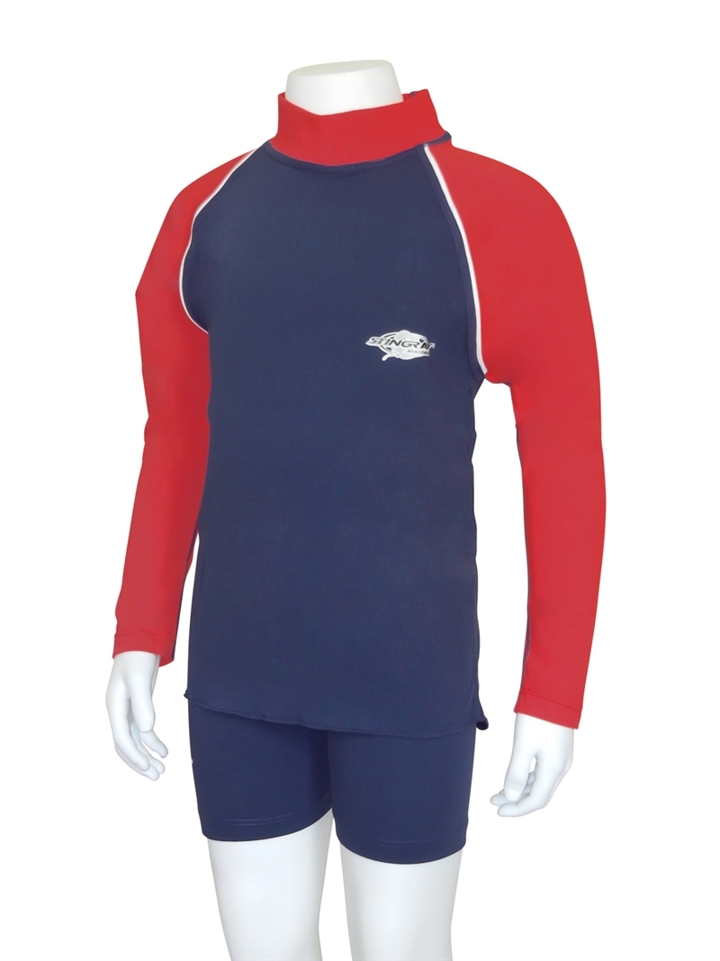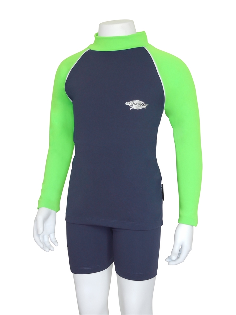 Kids long-sleeved rash shirt with high collar. The rash shirt is made from excellent Chlorine resistant fabric which is cool, soft, durable and quick drying with maximum sun protection factor - UPF 50+ which blocks > 97.5% of the suns UV radiation giving excellent UV protection - Comfortable to wear.excellent stretch and recovery - retains colour and shape,Great for swimming or outdoor activities.