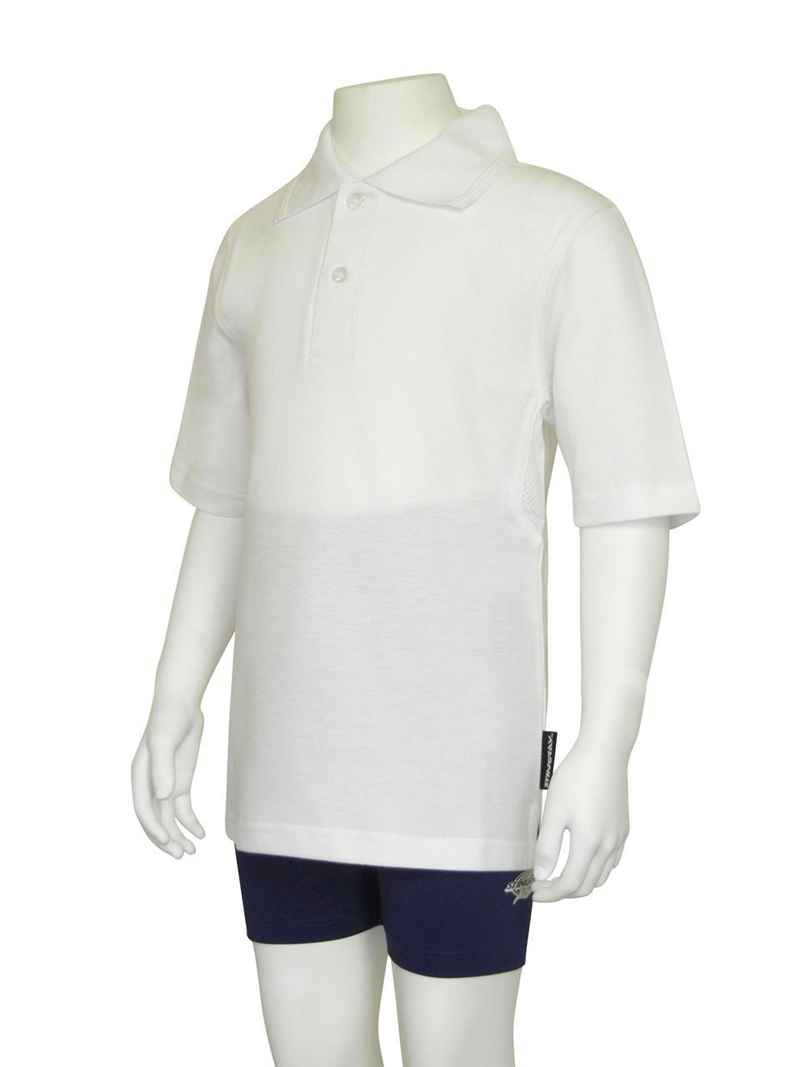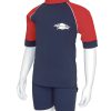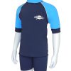 Kids short-sleeved rash shirt with high collar. The rash shirt is made from excellent Chlorine resistant fabric which is cool, soft, durable and quick drying with maximum sun protection rating - UPF 50+ which blocks > 97.5% of the suns UV radiation giving excellent UV protection.