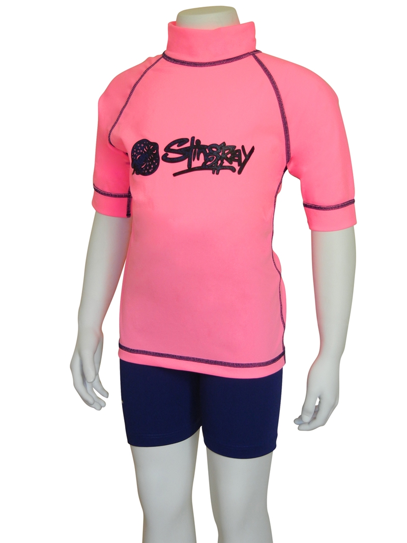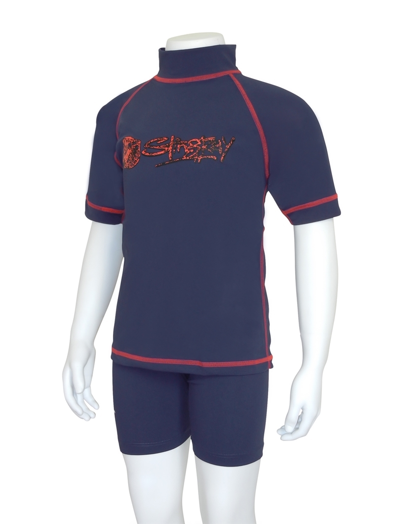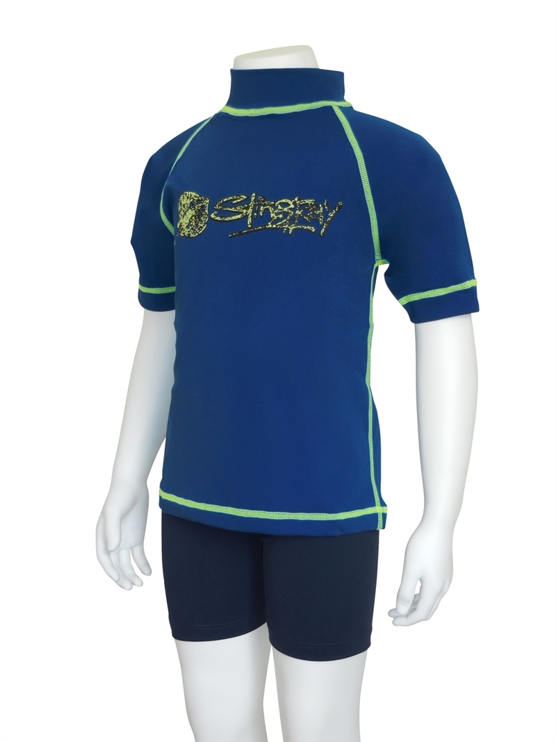 Kids short-sleeved surf swim shirt with high collar. The surf shirt is made from excellent Chlorine resistant fabric which is cool, soft, durable and quick drying with maximum sun protection factor - UPF 50+ which blocks > 97.5% of the suns UV radiation giving excellent UV protection.