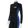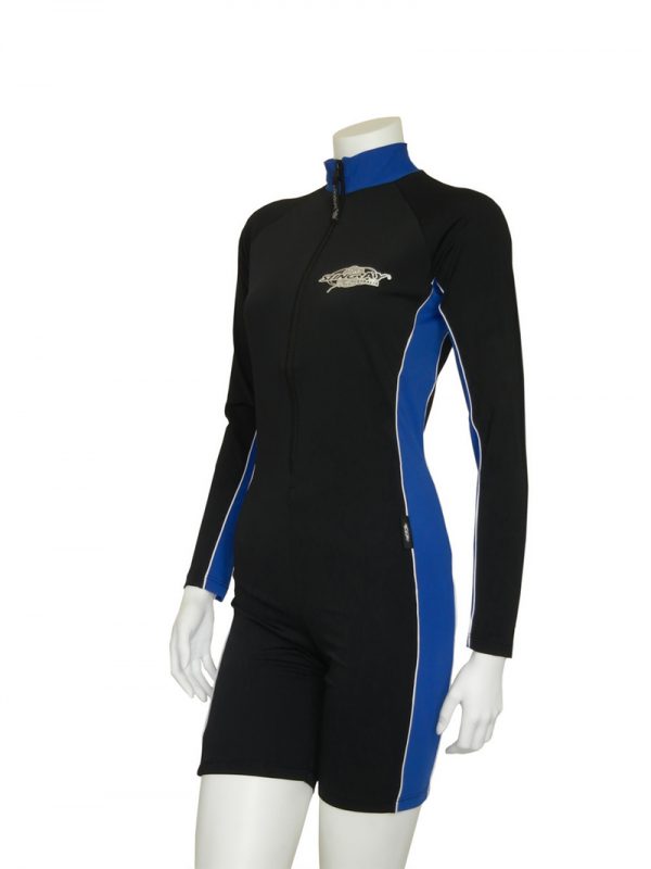 Ladies swimsuit (sunsuit) with long-sleeves, and contrast side panel and piping. The raysuit is made from excellent Chlorine resistant fabric which is cool, soft, durable and quick drying with maximum sun protection factor - UPF 50+ which blocks > 97.5% of the suns UV radiation giving excellent UV protection - Comfortable to wear, excellent stretch and recovery - retains colour and shape.