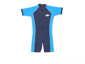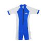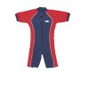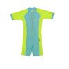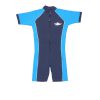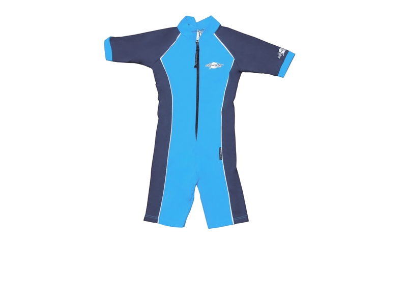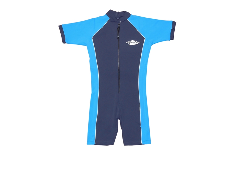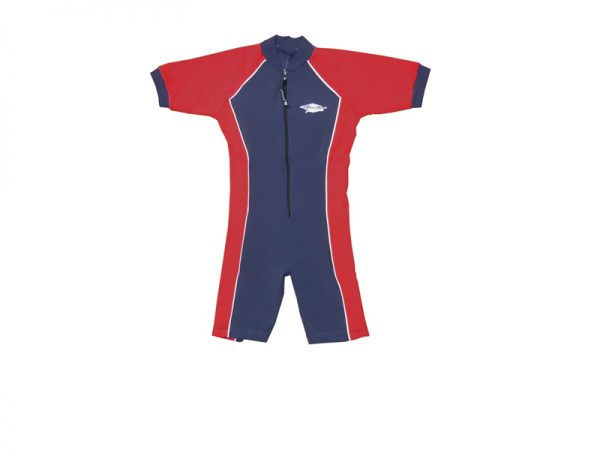 Duo coloured UPF50+ toddler sunsuit with short sleeves, front zip and high collar.