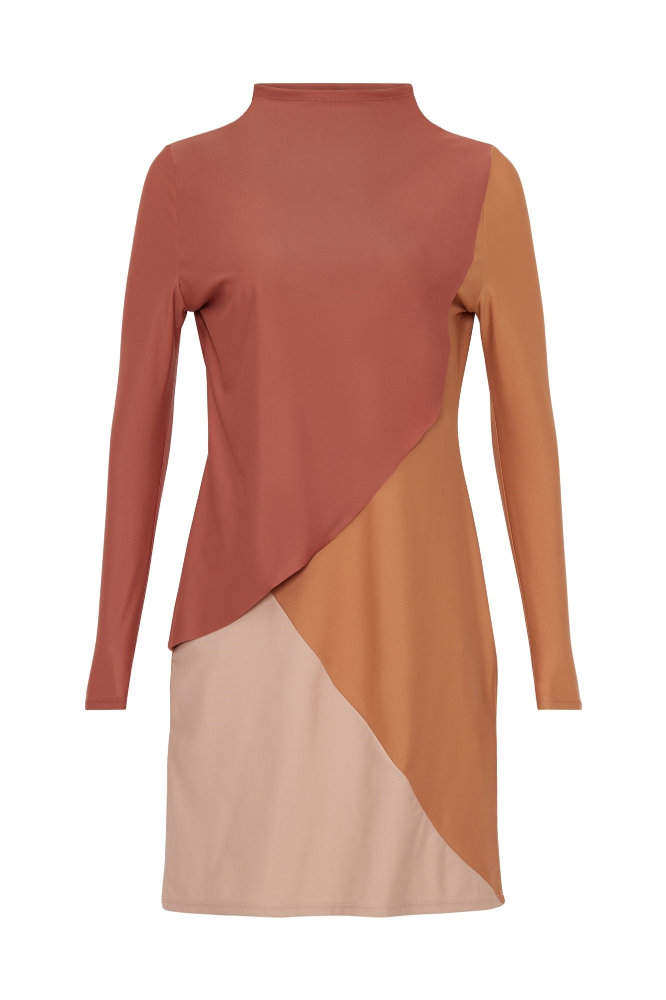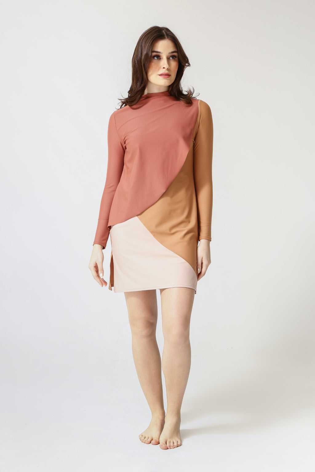 Full-coverage and sophisticated, the Cape Swim Dress is mid-thigh long and designed as a relaxed-fit for your size. Akin to the classic Maya, the diagonal cut between fabric colours creates a flattering break across your body. Additionally, the asymmetric cape grazes your torso and drapes accross the back to create a smooth silhouette with a dramatic appeal.