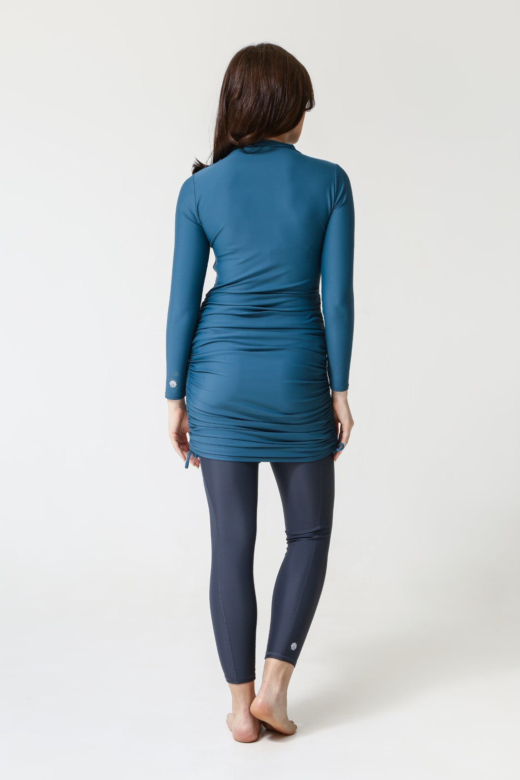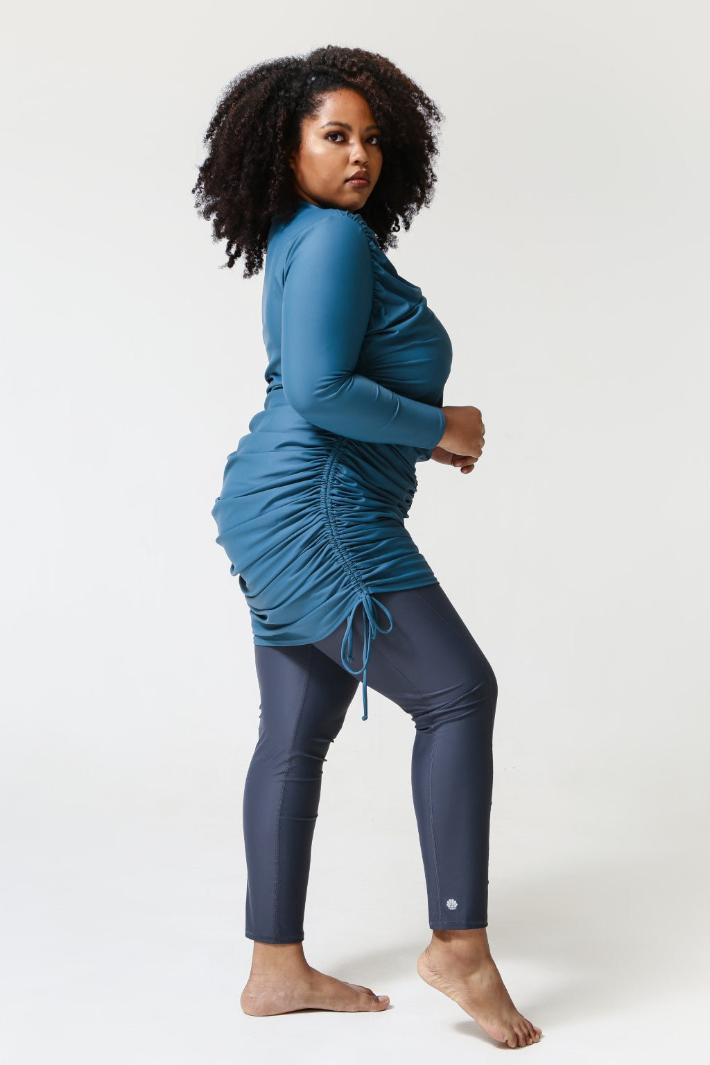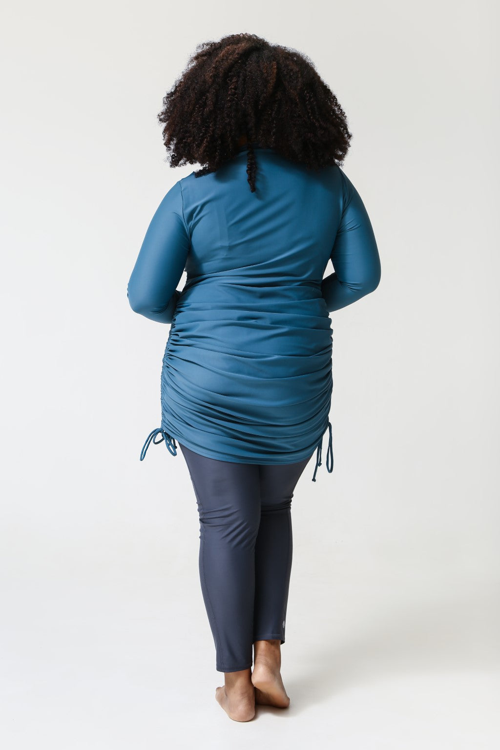 Inspired by the rolling waves of the sea, Isla is our adjustable length Swim Dress with ruche and shawl detailing. Our most versatile Swim Dress yet, Isla is designed to cater to your length preferences. By adjusting any or all of the three drawstrings, the dress can be extended all the way to your knees. Whilst the fit of the dress sits close to your body and accentuates your figure, the ruche detailing adds dimension in order to complement any body type.