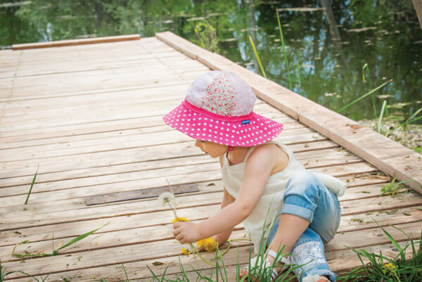 This adorable Platypus sun hat has an extra-wide brim to provide added protection for active toddlers on-the-go. 2 1/4" in the front, increasing to 3 1/4" in the back. Colour-coordinated, contrasting fabrics on the crown and brim bring shabby chic to the diaper set. 49cm hat fits ages 1-2 1/2 years. 100% cotton. Handwash cold. Wide Brim