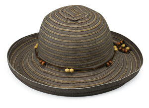 Put on the UPF50+ Breton hat and you will suddenly have an uncontrollable urge to grab your canvas shopping bag and stroll on down to the farmer's market. The contrasting poly-ribbon braid is a punch of colour, set off with a natural wooden-beaded leather tie. 4" brim.