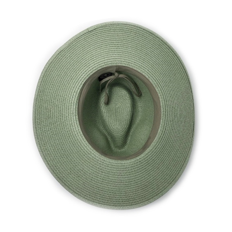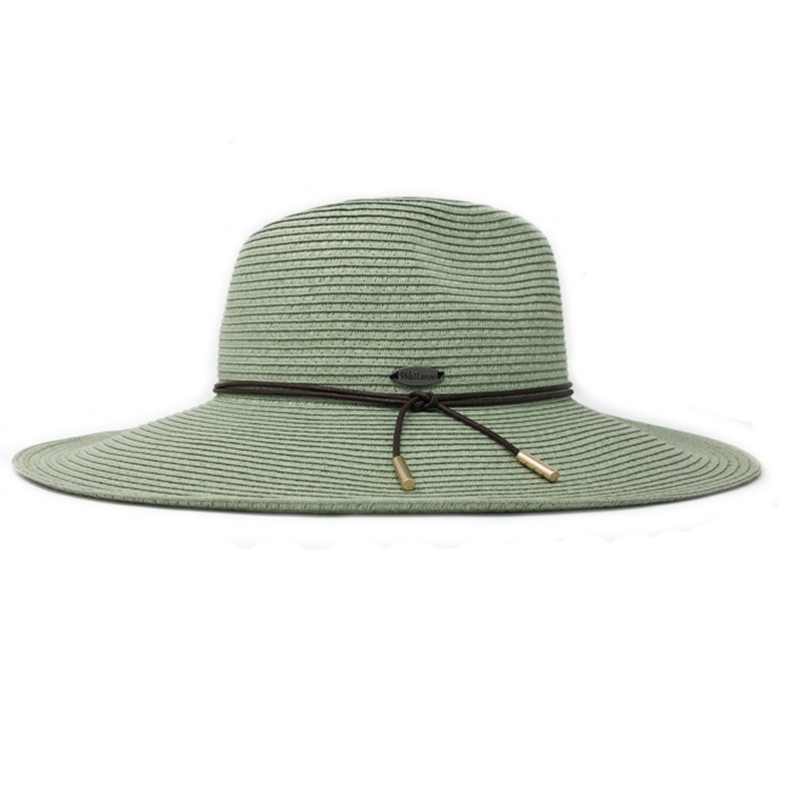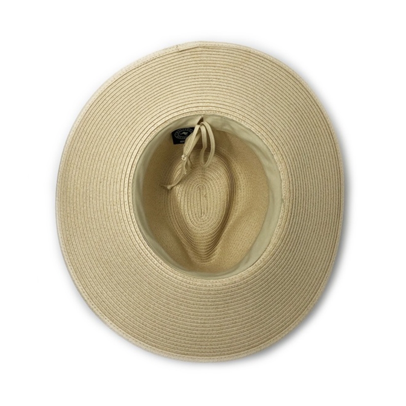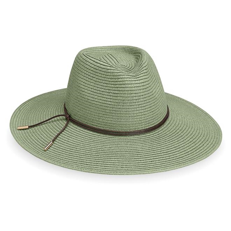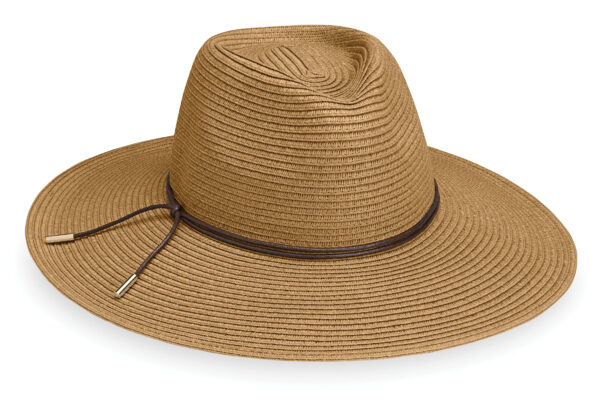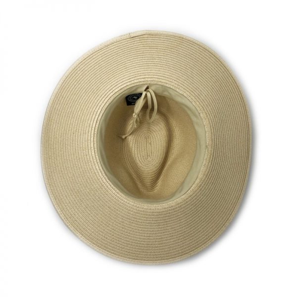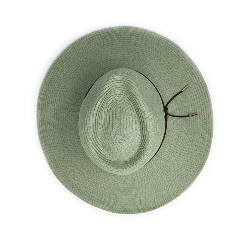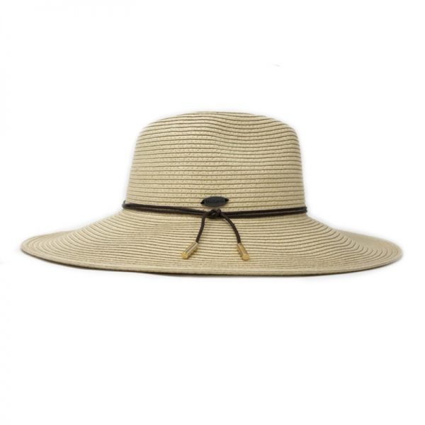 A super cool broad, 4" brimmed Rancher-style hat with clean lines for a modern, polished look. Neatly trimmed with a faux leather cord and gold end pieces. Inner drawstring adjusts fit. Packable. 100% paper braid exclusive of trim. Spot clean.